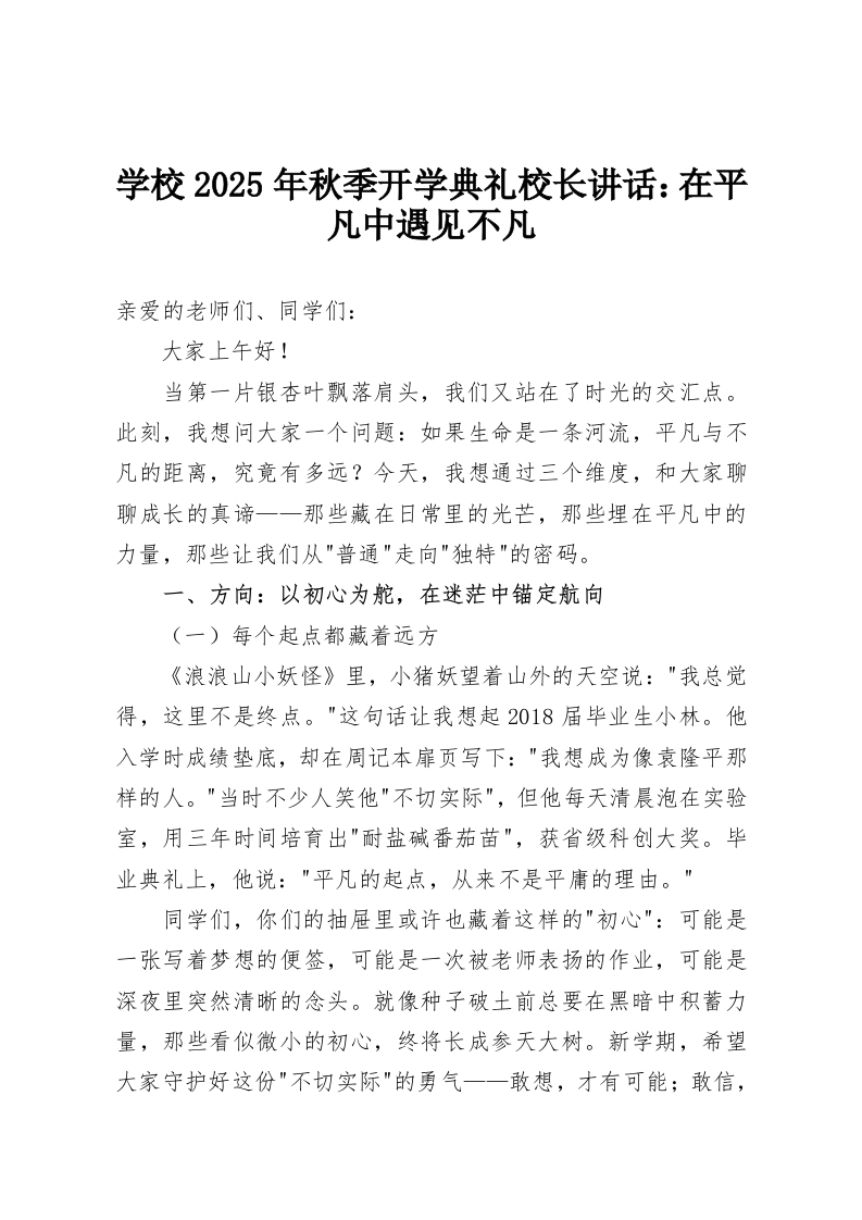 学校2025年秋季开学典礼校长讲话:在平凡中遇见不凡亲爱的老师们、同学们:大家上午好!当第一片银杏叶飘落肩头,我们又站在了时光的交汇点。此刻,我想问大家一个问题:如果生命是一条河流,平凡与不凡的距离,究竟有多远?今天,我想通过三个维度,和大家聊聊成长的真谛一一那些藏在日常里的光芒,那些埋在平凡中的力量,那些让我们从"普通”走向”独特"的密码。一、方向:以初心为舵,在迷茫中锚定航向(一)每个起点都藏着远方《浪浪山小妖怪》里,小猪妖望着山外的天空说:"我总觉得,这里不是终点。"这句话让我想起2018届毕业生小林。他入学时成绩垫底,却在周记本扉页写下:"我想成为像袁隆平那样的人。”当时不少人笑他"不切实际”,但他每天清晨泡在实验室,用三年时间培育出"耐盐碱番茄苗”,获省级科创大奖。毕业典礼上,他说:"平凡的起点,从来不是平庸的理由。”同学们,你们的抽屉里或许也藏着这样的"初心":可能是一张写着梦想的便签,可能是一次被老师表扬的作业,可能是深夜里突然清晰的念头。就像种子破土前总要在黑暗中积蓄力量,那些看似微小的初心,终将长成参天大树。新学期,希望大家守护好这份”不切实际"的勇气一一敢想,才有可能;敢信,