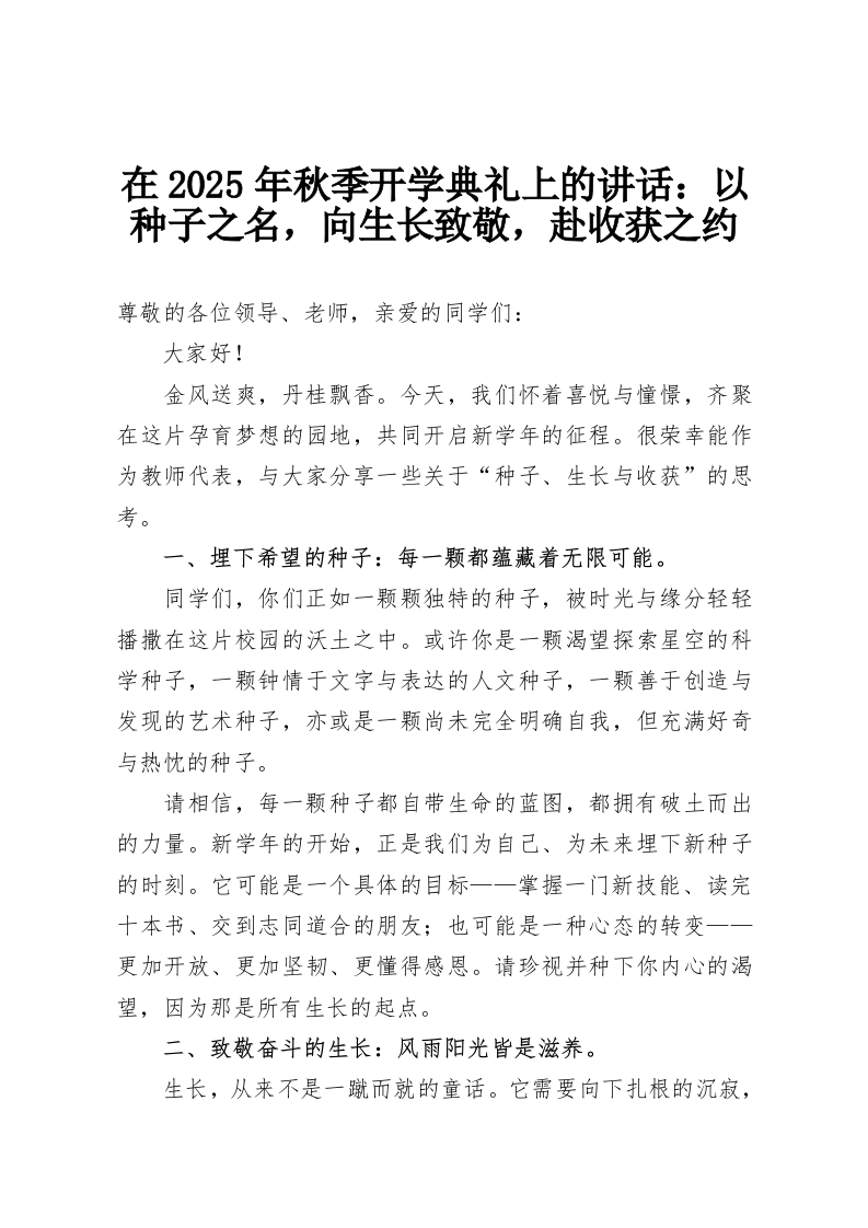 在2025年秋季开学典礼上的讲话:以种子之名,向生长致敬,赴收获之约尊敬的各位领导、老师,亲爱的同学们:大家好!金风送爽,丹桂飘香。今天,我们怀着喜悦与憧憬,齐聚在这片孕育梦想的园地,共同开启新学年的征程。很荣幸能作为教师代表,与大家分享一些关于“种子、生长与收获”的思考。一、埋下希望的种子:每一颗都蕴藏着无限可能。同学们,你们正如一颗颗独特的种子,被时光与缘分轻轻播撒在这片校园的沃土之中。或许你是一颗渴望探索星空的科学种子,一颗钟情于文字与表达的人文种子,一颗善于创造与发现的艺术种子,亦或是一颗尚未完全明确自我,但充满好奇与热忱的种子。请相信,每一颗种子都自带生命的蓝图,都拥有破土而出的力量。新学年的开始,正是我们为自己、为未来埋下新种子的时刻。它可能是一个具体的目标一一掌握一门新技能、读完十本书、交到志同道合的朋友;也可能是一种心态的转变一更加开放、更加坚韧、更懂得感恩。请珍视并种下你内心的渴望,因为那是所有生长的起点。二、致敬奋斗的生长:风雨阳光皆是滋养。生长,从来不是一蹴而就的童话。它需要向下扎根的沉寂,