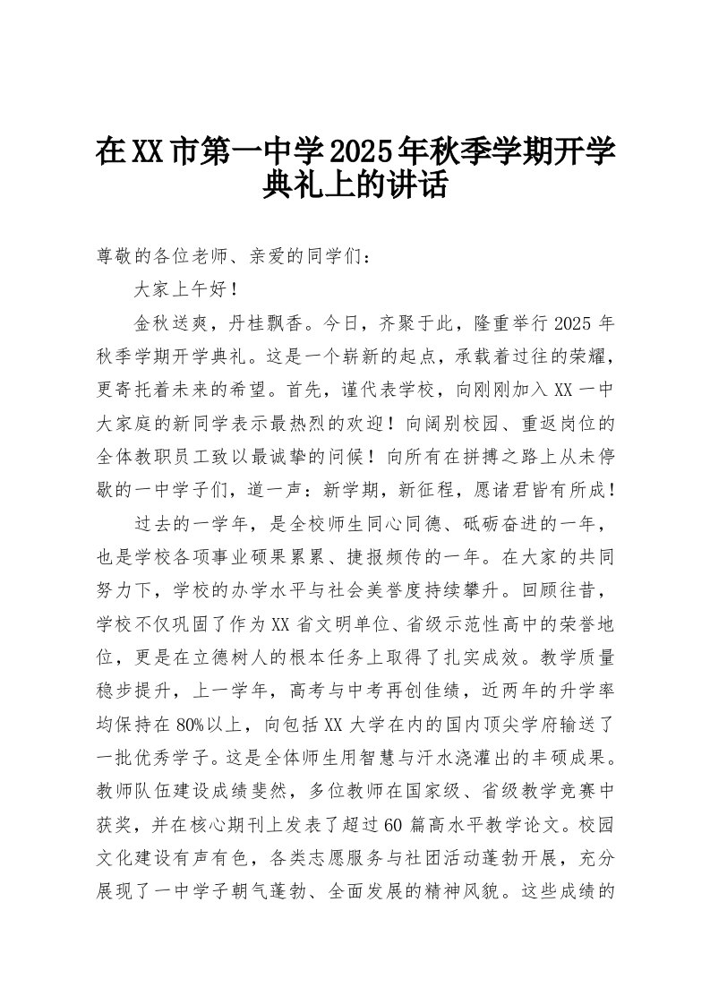 在Xx市第一中学2025年秋季学期开学典礼上的讲话尊敬的各位老师、亲爱的同学们:大家上午好!金秋送爽,丹桂飘香。今日,齐聚于此,隆重举行2025年秋季学期开学典礼。这是一个崭新的起点,承载着过往的荣耀,更寄托着未来的希望。首先,谨代表学校,向刚刚加入XX一中大家庭的新同学表示最热烈的欢迎!向阔别校园、重返岗位的全体教职员工致以最诚挚的问候!向所有在拼搏之路上从未停歇的一中学子们,道一声:新学期,新征程,愿诸君皆有所成!过去的一学年,是全校师生同心同德、砥砺奋进的一年,也是学校各项事业硕果累累、捷报频传的一年。在大家的共同努力下,学校的办学水平与社会美誉度持续攀升。回顾往昔,学校不仅巩固了作为XX省文明单位、省级示范性高中的荣誉地位,更是在立德树人的根本任务上取得了扎实成效。教学质量稳步提升,上一学年,高考与中考再创佳绩,近两年的升学率均保持在80%以上,向包括XX大学在内的国内顶尖学府输送了一批优秀学子。这是全体师生用智慧与汗水浇灌出的丰硕成果。教师队伍建设成绩斐然,多位教师在国家级、省级教学竞赛中获奖,并在核心期刊上发表了超过60篇高水平教学论文。校园文化建设有声有色,各类志愿服务与社团活动蓬勃开展,充分展现了一中学子朝气蓬勃、全面发展的精神风貌。这些成绩的