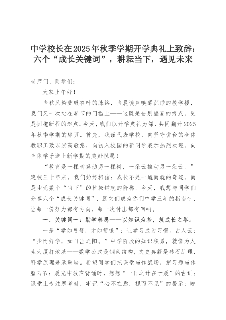 中学校长在2025年秋季学期开学典礼上致辞:六个“成长关键词”,耕耘当下,遇见未来老师们、同学们:大家上午好!当秋风染黄银杏叶的脉络,当晨读声唤醒沉睡的教学楼,我们又一次站在季节的门槛上一一这既是告别盛夏的终点,更是拥抱新程的起点。今天,我们以开学典礼为媒,共同翻开2025年秋季学期的扉页。首先,我谨代表学校,向坚守讲台的全体教职工致以崇高敬意,向初入校园的新同学表示热烈欢迎,向全体学子送上新学期的美好祝愿!“教育是一棵树摇动另一棵树,一朵云推动另一朵云。”建校三十年来,我们始终相信:成长不是一蹴而就的奇迹,而是由无数个“当下”的耕耘铺就的阶梯。今天,我想与同学们分享六个“成长关键词”,愿它们成为你们中学三年的指南针,让每一份努力都有方向,每一次付出都有回响。一、关键词一:勤学善思一一以知识为基,筑成长之塔。一是“学如弓弩,才如箭镞”:让学习成为习惯。古人云:“少而好学,如日出之阳。”中学阶段的知识积累,就像为人生大厦打地基一一数学公式是钢架结构,文史典籍是砖石肌理,科学原理是承重墙。希望同学们把课堂当作战场,把习题当作磨刀石:晨光中放声背诵时,想想“一日之计在于晨”的古训:课堂上专注思考时,牢记“心不在焉,视而不见”的警示;晚