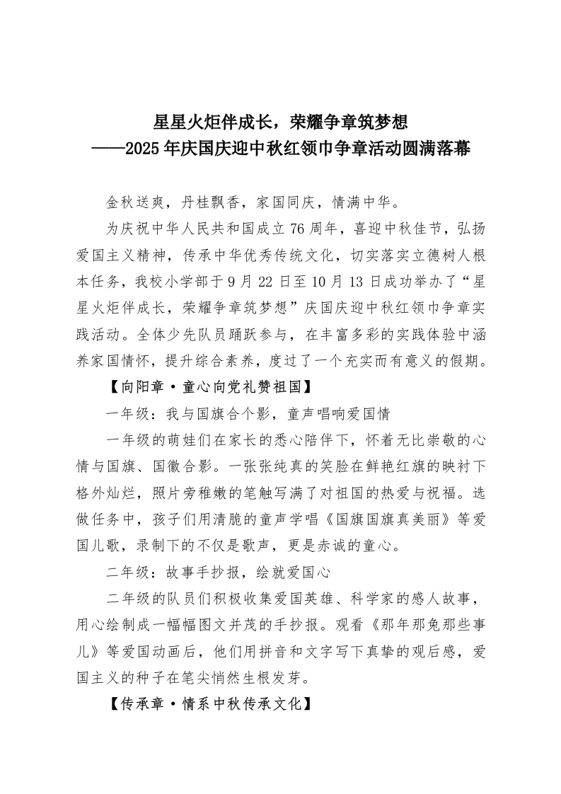 星星火炬伴成长,荣耀争章筑梦想一2025年庆国庆迎中秋红领巾争章活动圆满落幕金秋送爽,丹桂飘香,家国同庆,情满中华。为庆祝中华人民共和国成立76周年,喜迎中秋佳节,弘扬爱国主义精神,传承中华优秀传统文化,切实落实立德树人根本任务,我校小学部于9月22日至10月13日成功举办了“星星火炬伴成长,荣耀争章筑梦想”庆国庆迎中秋红领巾争章实践活动。全体少先队员踊跃参与,在丰富多彩的实践体验中涵养家国情怀,提升综合素养,度过了一个充实而有意义的假期。【向阳章·童心向党礼赞祖国】一年级:我与国旗合个影,童声唱响爱国情一年级的萌娃们在家长的悉心陪伴下,怀着无比崇敬的心情与国旗、国徽合影。一张张纯真的笑脸在鲜艳红旗的映衬下格外灿烂,照片旁稚嫩的笔触写满了对祖国的热爱与祝福。选做任务中,孩子们用清脆的童声学唱《国旗国旗真美丽》等爱国儿歌,录制下的不仅是歌声,更是赤诚的童心。二年级:故事手抄报,绘就爱国心二年级的队员们积极收集爱国英雄、科学家的感人故事,用心绘制成一幅幅图文并茂的手抄报。观看《那年那兔那些事儿》等爱国动画后,他们用拼音和文字写下真挚的观后感,爱国主义的种子在笔尖悄然生根发芽。【传承章·情系中秋传承文化】