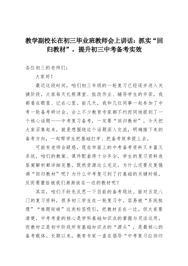 教学副校长在初三毕业班教师会上讲话:抓实“回归教材”,提升初三中考备考实效各位初三的老师们:大家好!最近这段时间,咱们初三年级的一轮复习已经逐步进入关键阶段,大家每天扎根课堂、批改作业、辅导学生的辛苦,我都看在眼里、记在心里。前几天,我和几位同事一起参加了中考一轮备考研讨会,会上不少教育专家都不约而同地提到了一个核心话题一一中考复习备考,一定要“回归教材”。今天把大家召集起来,就是想围绕这个话题深入交流,明确接下来的备考方向,一起帮学生把基础打牢、把备考效率提上去。可能有老师会疑惑,现在市面上的中考备考资料又丰富又系统,咱们的教案、课件配套得十分齐全,学生的复习资料连答案解析都详细完整。既然资源这么充足,为什么还要反复强调“回归教材”呢?为什么中考复习到了打基础的关键时候,反而要重拾被我们渐渐放在一边的教材呢?其实,咱们不妨先反思一下目前的备考现状。面对五花八门的复习资料,很多初三学生在一轮复习中,容易被“系统梳理”“难题突破”这类标签吸引,把教材丢在一边。但大家要清楚,中考考查的核心是学科基础知识点的掌握与灵活运用,而教材正是初中阶段所有基础知识点的“源头”,是最核心的备考载体。长期以来,教育专家一直在倡导“中考复习应回归