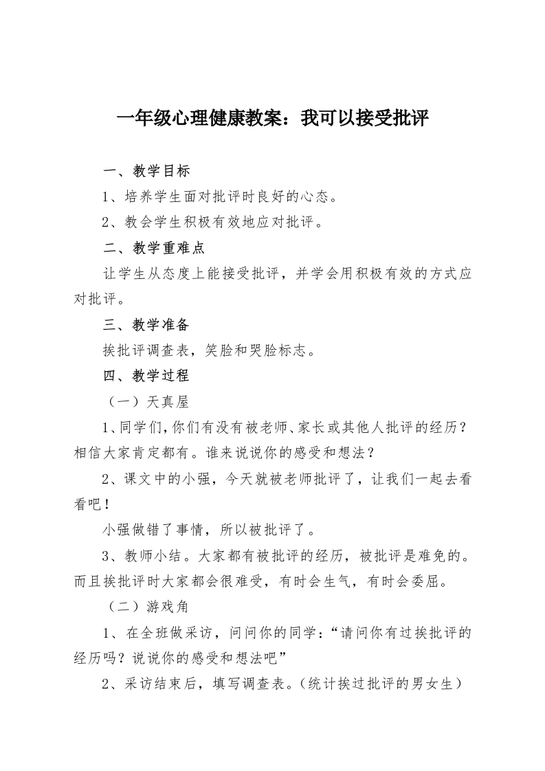 一年级心理健康教案:我可以接受批评一、教学目标1、培养学生面对批评时良好的心态。2、教会学生积极有效地应对批评。二、教学重难点让学生从态度上能接受批评,并学会用积极有效的方式应对批评。三、教学准备挨批评调查表,笑脸和哭脸标志。四、教学过程(一)天真屋1、同学们,你们有没有被老师、家长或其他人批评的经历?相信大家肯定都有。谁来说说你的感受和想法?2、课文中的小强,今天就被老师批评了,让我们一起去看看吧!小强做错了事情,所以被批评了。3、教师小结。大家都有被批评的经历,被批评是难免的。而且挨批评时大家都会很难受,有时会生气,有时会委屈。(二)游戏角1、在全班做采访,问问你的同学:“请问你有过挨批评的经历吗?说说你的感受和想法吧”2、采访结束后,填写调查表。(统计挨过批评的男女生)