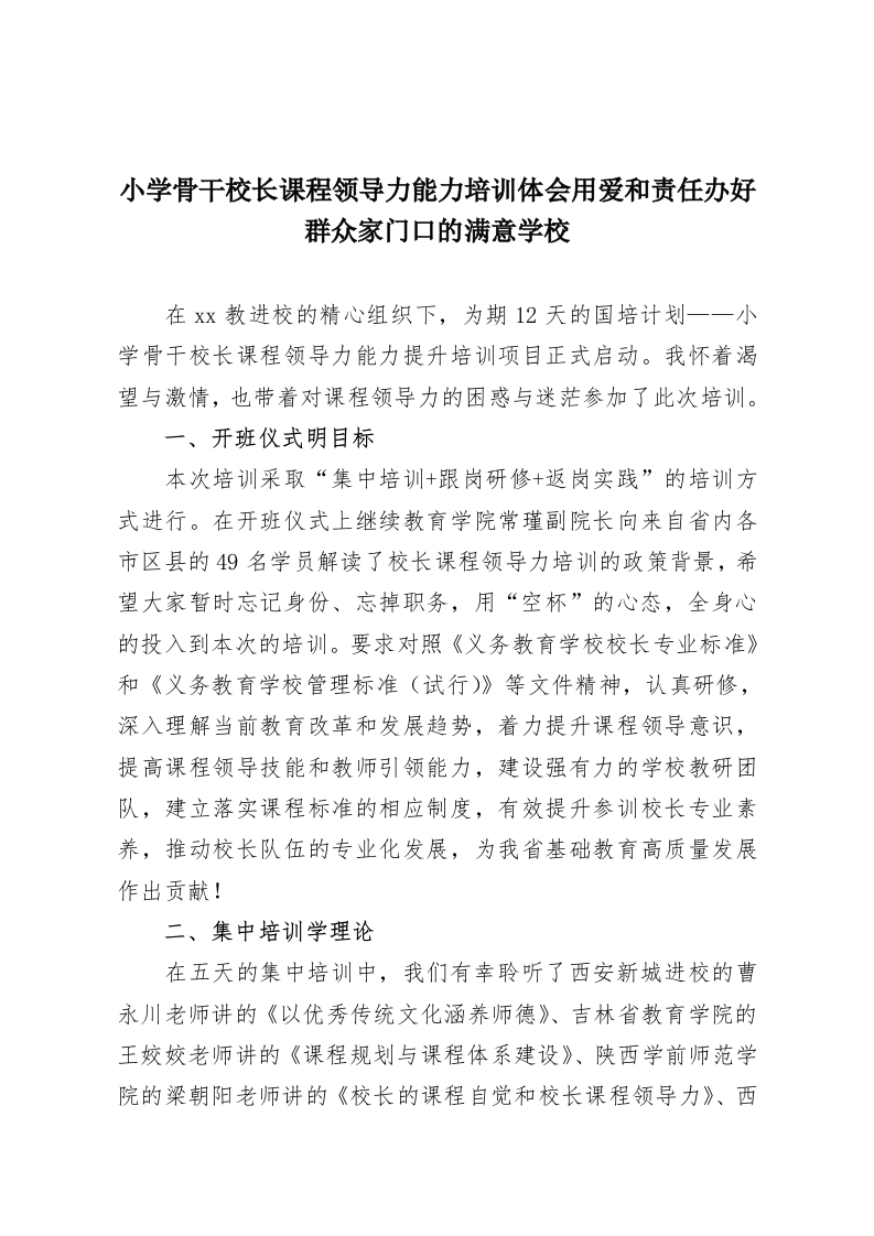 小学骨干校长课程领导力能力培训体会用爱和责任办好群众家门口的满意学校在xx教进校的精心组织下,为期12天的国培计划一一小学骨干校长课程领导力能力提升培训项目正式启动。我怀着渴望与激情,也带着对课程领导力的困惑与迷茫参加了此次培训。一、开班仪式明目标本次培训采取“集中培训+跟岗研修+返岗实践”的培训方式进行。在开班仪式上继续教育学院常瑾副院长向来自省内各市区县的49名学员解读了校长课程领导力培训的政策背景,希望大家暂时忘记身份、忘掉职务,用“空杯”的心态,全身心的投入到本次的培训。要求对照《义务教育学校校长专业标准》和《义务教育学校管理标准(试行)》等文件精神,认真研修,深入理解当前教育改革和发展趋势,着力提升课程领导意识,提高课程领导技能和教师引领能力,建设强有力的学校教研团队,建立落实课程标准的相应制度,有效提升参训校长专业素养,推动校长队伍的专业化发展,为我省基础教育高质量发展作出贡献!二、集中培训学理论在五天的集中培训中,我们有幸聆听了西安新城进校的曹永川老师讲的《以优秀传统文化涵养师德》、吉林省教育学院的王姣姣老师讲的《课程规划与课程体系建设》、陕西学前师范学院的梁朝阳老师讲的《校长的课程自觉和校长课程领导力》、西