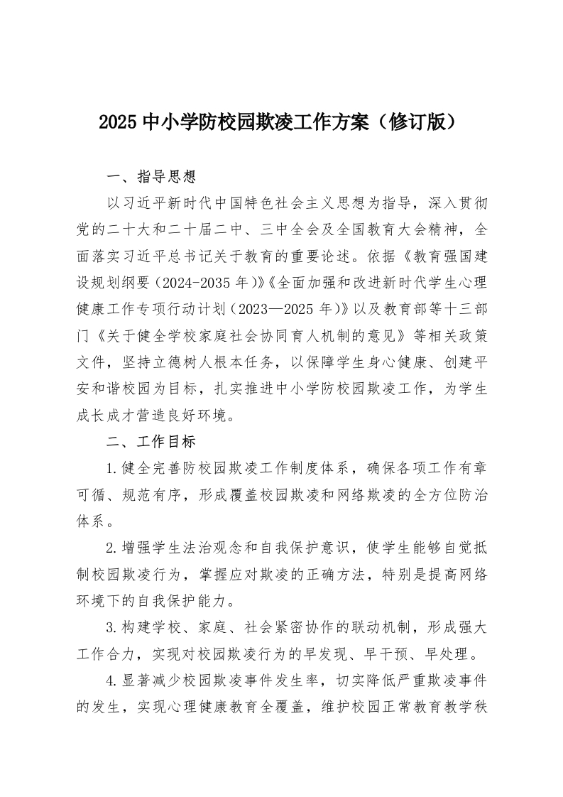 2025中小学防校园欺凌工作方案(修订版)一、指导思想以习近平新时代中国特色社会主义思想为指导,深入贯彻党的二十大和二十届二中、三中全会及全国教育大会精神,全面落实习近平总书记关于教育的重要论述。依据《教育强国建设规划纲要(2024-2035年)》《全面加强和改进新时代学生心理健康工作专项行动计划(2023一2025年)》以及教育部等十三部门《关于健全学校家庭社会协同育人机制的意见》等相关政策文件,坚持立德树人根本任务,以保障学生身心健康、创建平安和谐校园为目标,扎实推进中小学防校园欺凌工作,为学生成长成才营造良好环境。二、工作目标1.健全完善防校园欺凌工作制度体系,确保各项工作有章可循、规范有序,形成覆盖校园欺凌和网络欺凌的全方位防治体系。2.增强学生法治观念和自我保护意识,使学生能够自觉抵制校园欺凌行为,掌握应对欺凌的正确方法,特别是提高网络环境下的自我保护能力。3.构建学校、家庭、社会紧密协作的联动机制,形成强大工作合力,实现对校园欺凌行为的早发现、早干预、早处理。4.显著减少校园欺凌事件发生率,切实降低严重欺凌事件的发生,实现心理健康教育全覆盖,维护校园正常教育教学秩