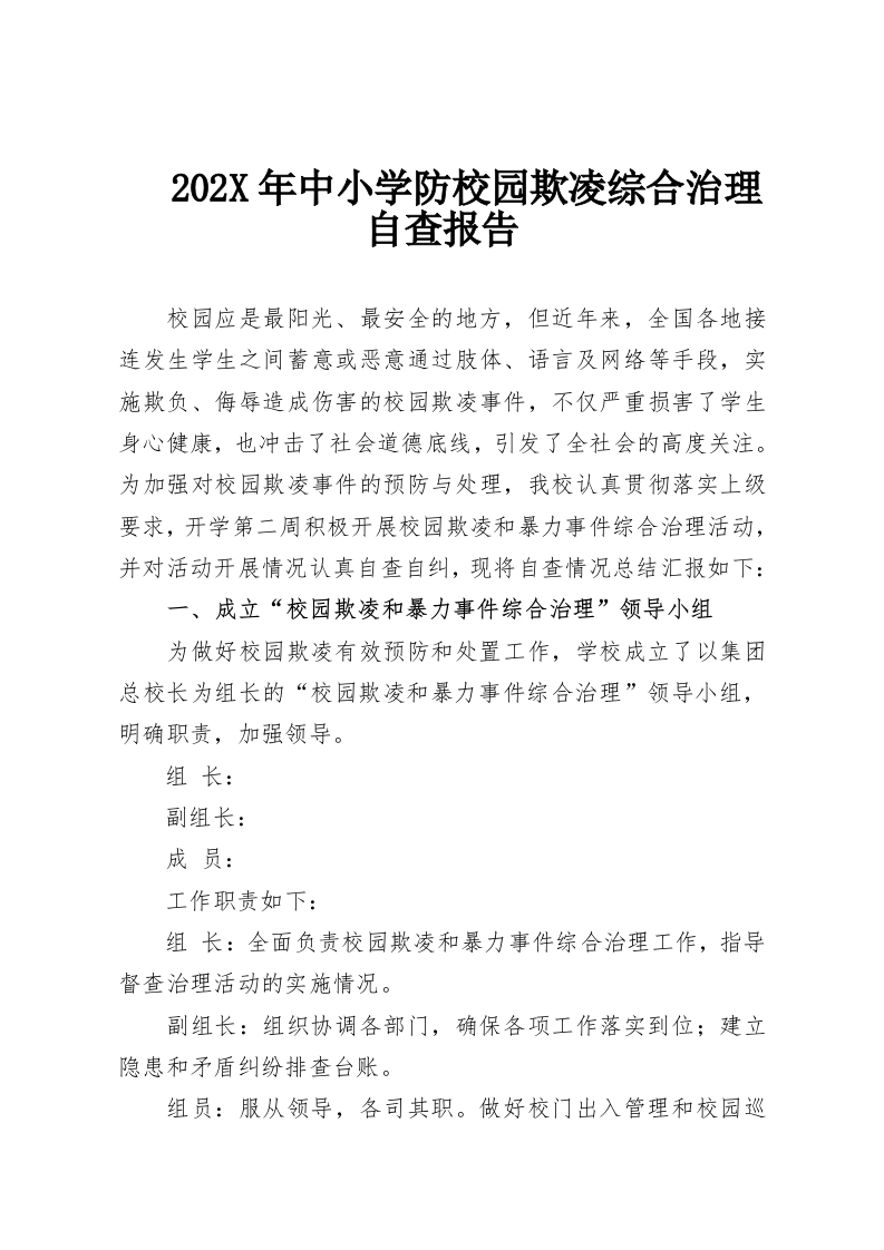 202X年中小学防校园欺凌综合治理自查报告校园应是最阳光、最安全的地方,但近年来,全国各地接连发生学生之间蓄意或恶意通过肢体、语言及网络等手段,实施欺负、侮辱造成伤害的校园欺凌事件,不仅严重损害了学生身心健康,也冲击了社会道德底线,引发了全社会的高度关注。为加强对校园欺凌事件的预防与处理,我校认真贯彻落实上级要求,开学第二周积极开展校园欺凌和暴力事件综合治理活动,并对活动开展情况认真自查自纠,现将自查情况总结汇报如下:一、成立“校园欺凌和暴力事件综合治理”领导小组为做好校园欺凌有效预防和处置工作,学校成立了以集团总校长为组长的“校园欺凌和暴力事件综合治理”领导小组,明确职责,加强领导。组长:副组长:成员:工作职责如下:组长:全面负责校园欺凌和暴力事件综合治理工作,指导督查治理活动的实施情况。副组长:组织协调各部门,确保各项工作落实到位;建立隐患和矛盾纠纷排查台账。组员:服从领导,各司其职。做好校门出入管理和校园巡