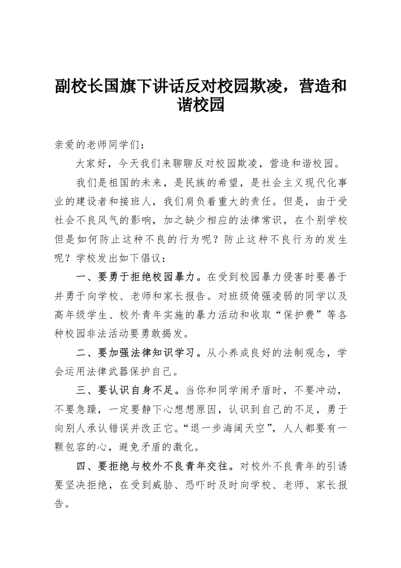 副校长国旗下讲话反对校园欺凌,营造和谐校园亲爱的老师同学们:大家好,今天我们来聊聊反对校园欺凌,营造和谐校园。我们是祖国的未来,是民族的希望,是社会主义现代化事业的建设者和接班人,我们肩负着重大的责任。但是,由于受社会不良风气的影响,加之缺少相应的法律常识,在个别学校但是如何防止这种不良的行为呢?防止这种不良行为的发生呢?学校发出如下倡议:一、要勇于拒绝校园暴力。在受到校园暴力侵害时要善于并勇于向学校、老师和家长报告。对班级倚强凌弱的同学以及高年级学生、校外青年实施的暴力活动和收取“保护费”等各种校园非法活动要勇敢揭发。二、要加强法律知识学习。从小养成良好的法制观念,学会运用法律武器保护自己。三、要认识自身不足。当你和同学闹矛盾时,不要冲动,不要急躁,一定要静下心想想原因,认识到自己的不足,勇于向别人承认错误并改正它。“退一步海阔天空”,人人都要有一颗包容的心,避免矛盾的激化。四、要拒绝与校外不良青年交往。对校外不良青年的引诱要坚决拒绝,在受到威胁、恐吓时及时向学校、老师、家长报告。