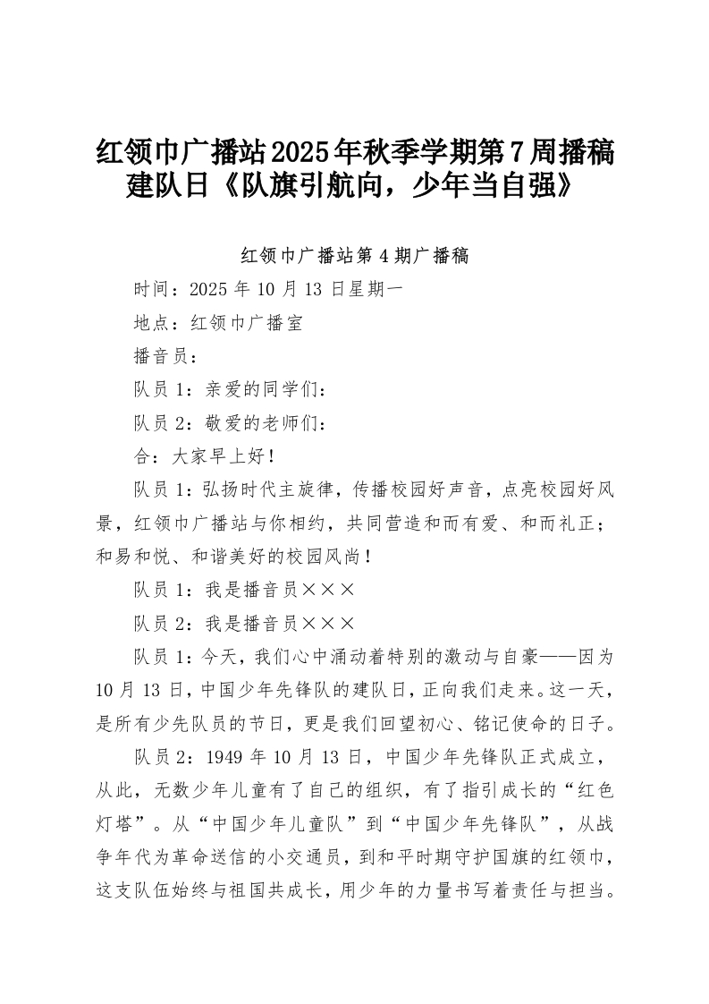 红领巾广播站2025年秋季学期第7周播稿建队日《队旗引航向,少年当自强》红领巾广播站第4期广播稿时间:2025年10月13日星期一地点:红领巾广播室播音员:队员1:亲爱的同学们:队员2:敬爱的老师们:合:大家早上好!队员1:弘扬时代主旋律,传播校园好声音,点亮校园好风景,红领巾广播站与你相约,共同营造和而有爱、和而礼正;和易和悦、和谐美好的校园风尚!队员1:我是播音员×××队员2:我是播音员×××队员1:今天,我们心中涌动着特别的激动与自豪一一因为10月13日,中国少年先锋队的建队日,正向我们走来。这一天,是所有少先队员的节日,更是我们回望初心、铭记使命的日子。队员2:1949年10月13日,中国少年先锋队正式成立,从此,无数少年儿童有了自己的组织,有了指引成长的“红色灯塔”。从“中国少年儿童队”到“中国少年先锋队”,从战争年代为革命送信的小交通员,到和平时期守护国旗的红领巾,这支队伍始终与祖国共成长,用少年的力量书写着责任与担当。