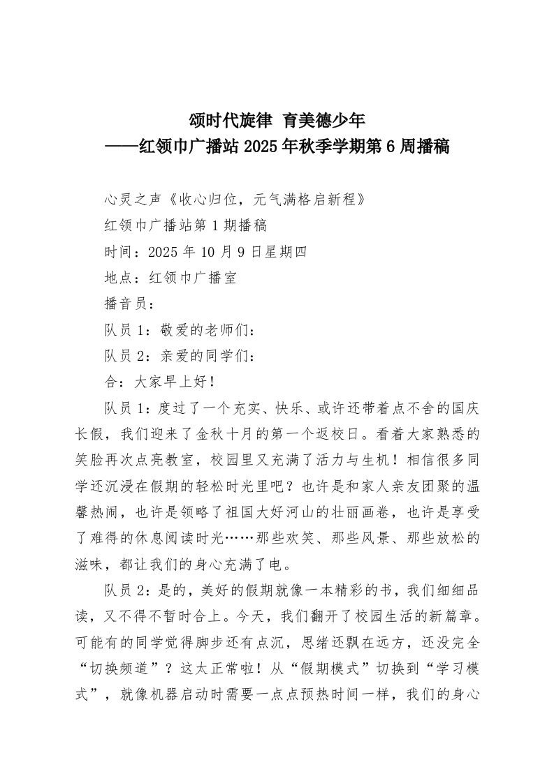 颂时代旋律育美德少年一红领巾广播站2025年秋季学期第6周播稿心灵之声《收心归位,元气满格启新程》红领巾广播站第1期播稿时间:2025年10月9日星期四地点:红领巾广播室播音员:队员1:敬爱的老师们:队员2:亲爱的同学们:合:大家早上好!队员1:度过了一个充实、快乐、或许还带着点不舍的国庆长假,我们迎来了金秋十月的第一个返校日。看着大家熟悉的笑脸再次点亮教室,校园里又充满了活力与生机!相信很多同学还沉浸在假期的轻松时光里吧?也许是和家人亲友团聚的温馨热闹,也许是领略了祖国大好河山的壮丽画卷,也许是享受了难得的休息阅读时光…那些欢笑、那些风景、那些放松的滋味,都让我们的身心充满了电。队员2:是的,美好的假期就像一本精彩的书,我们细细品读,又不得不暂时合上。今天,我们翻开了校园生活的新篇章。可能有的同学觉得脚步还有点沉,思绪还飘在远方,还没完全“切换频道”?这太正常啦!从“假期模式”切换到“学习模式”,就像机器启动时需要一点点预热时间一样,我们的身心