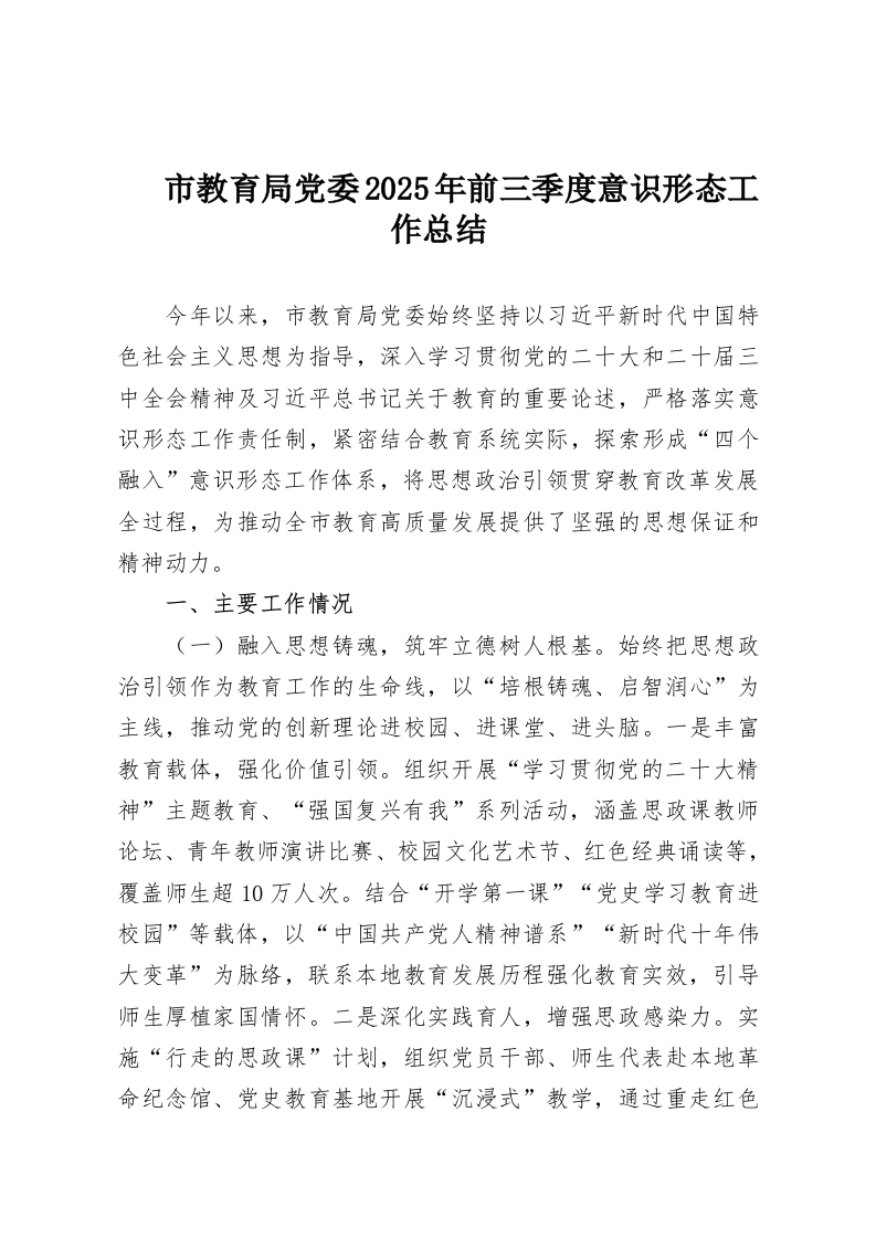 市教育局党委2025年前三季度意识形态工作总结今年以来,市教育局党委始终坚持以习近平新时代中国特色社会主义思想为指导,深入学习贯彻党的二十大和二十届三中全会精神及习近平总书记关于教育的重要论述,严格落实意识形态工作责任制,紧密结合教育系统实际,探索形成“四个融入”意识形态工作体系,将思想政治引领贯穿教育改革发展全过程,为推动全市教育高质量发展提供了坚强的思想保证和精神动力。一、主要工作情况(一)融入思想铸魂,筑牢立德树人根基。始终把思想政治引领作为教育工作的生命线,以“培根铸魂、启智润心”为主线,推动党的创新理论进校园、进课堂、进头脑。一是丰富教育载体,强化价值引领。组织开展“学习贯彻党的二十大精神”主题教育、“强国复兴有我”系列活动,涵盖思政课教师论坛、青年教师演讲比赛、校园文化艺术节、红色经典诵读等,覆盖师生超10万人次。结合“开学第一课”“党史学习教育进校园”等载体,以“中国共产党人精神谱系”“新时代十年伟大变革”为脉络,联系本地教育发展历程强化教育实效,引导师生厚植家国情怀。二是深化实践育人,增强思政感染力。实施“行走的思政课”计划,组织党员干部、师生代表赴本地革命纪念馆、党史教育基地开展“沉浸式”教学,通过重走红色