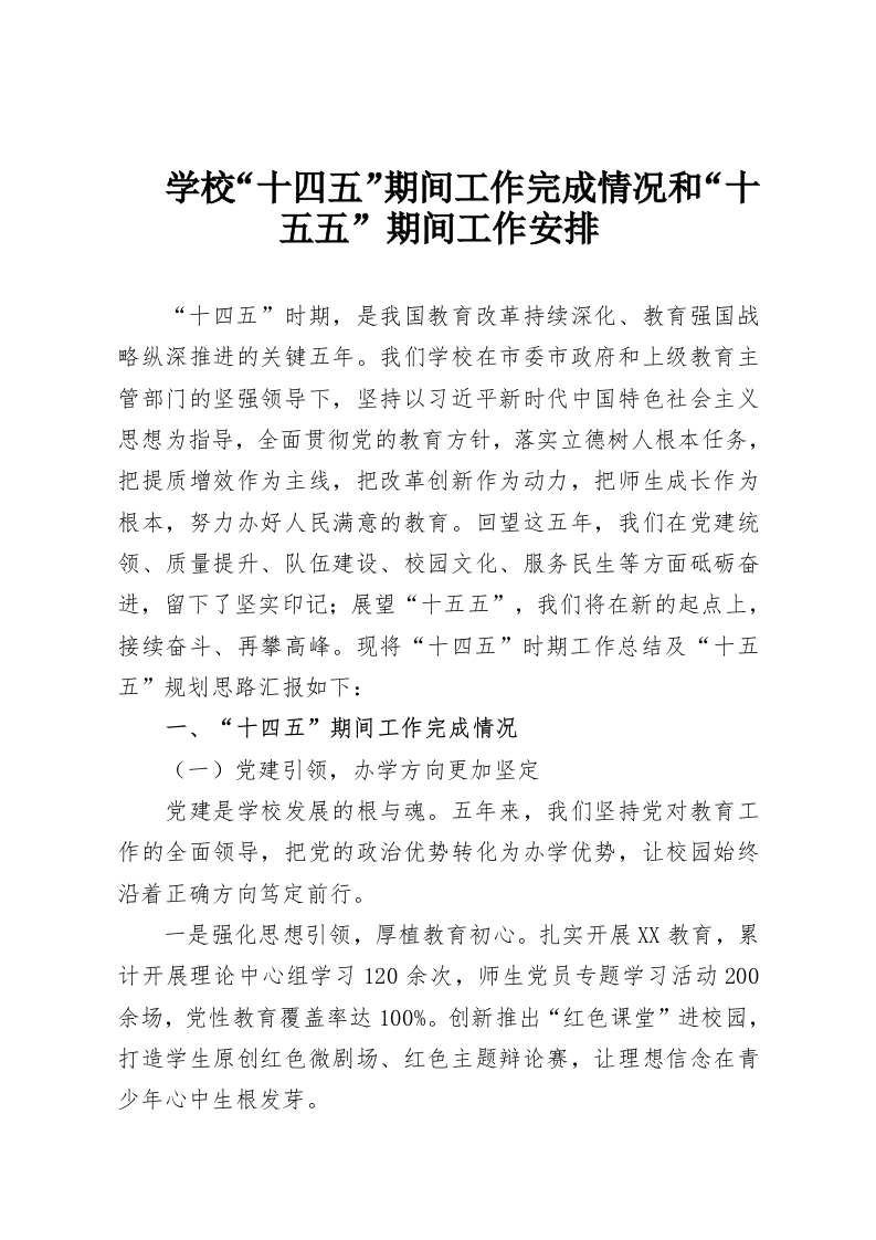 学校“十四五”期间工作完成情况和“十五五”期间工作安排“十四五”时期,是我国教育改革持续深化、教育强国战略纵深推进的关键五年。我们学校在市委市政府和上级教育主管部门的坚强领导下,坚持以习近平新时代中国特色社会主义思想为指导,全面贯彻党的教育方针,落实立德树人根本任务,把提质增效作为主线,把改革创新作为动力,把师生成长作为根本,努力办好人民满意的教育。回望这五年,我们在党建统领、质量提升、队伍建设、校园文化、服务民生等方面砥砺奋进,留下了坚实印记;展望“十五五”,我们将在新的起点上,接续奋斗、再攀高峰。现将“十四五”时期工作总结及“十五五”规划思路汇报如下:一、“十四五”期间工作完成情况(一)党建引领,办学方向更加坚定党建是学校发展的根与魂。五年来,我们坚持党对教育工作的全面领导,把党的政治优势转化为办学优势,让校园始终沿着正确方向笃定前行。一是强化思想引领,厚植教育初心。扎实开展XX教育,累计开展理论中心组学习120余次,师生党员专题学习活动200余场,党性教育覆盖率达100%。创新推出“红色课堂”进校园,打造学生原创红色微剧场、红色主题辩论赛,让理想信念在青少年心中生根发芽。