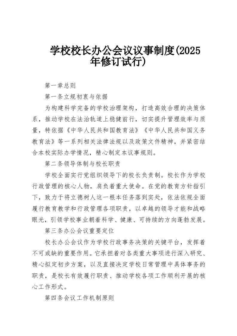 学校校长办公会议议事制度(2025年修订试行)第一章总则第一条立规初衷与依据为构建科学完备的学校治理架构,打造高效合理的决策体系,推动学校在法治轨道上稳健前行,切实提升管理效率与质量,特依据《中华人民共和国教育法》《中华人民共和国义务教育法》等一系列相关法律法规以及政策文件精神,并紧密结合本校实际办学情况,精心制定本议事规则。第二条领导体制与校长职责学校全面实行党组织领导下的校长负责制。校长作为学校行政管理的核心人物,肩负着重大使命。在党的教育方针指引下,致力于将立德树人这一根本任务落到实处,依法依规全面履行教育教学和行政管理各项职责,以卓越的领导才能和战略眼光,引领学校事业朝着科学、健康、可持续的方向蓬勃发展。第三条办公会议重要定位校长办公会议作为学校行政事务决策的关键平台,发挥着不可或缺的重要作用。它承担着对各类重大事项进行深入研究、精心拟定初步方案,以及直接决定学校日常管理中具体事务的职责,是校长有效履行职责、推动学校各项工作顺利开展的核心工作形式。第四条会议工作机制原则