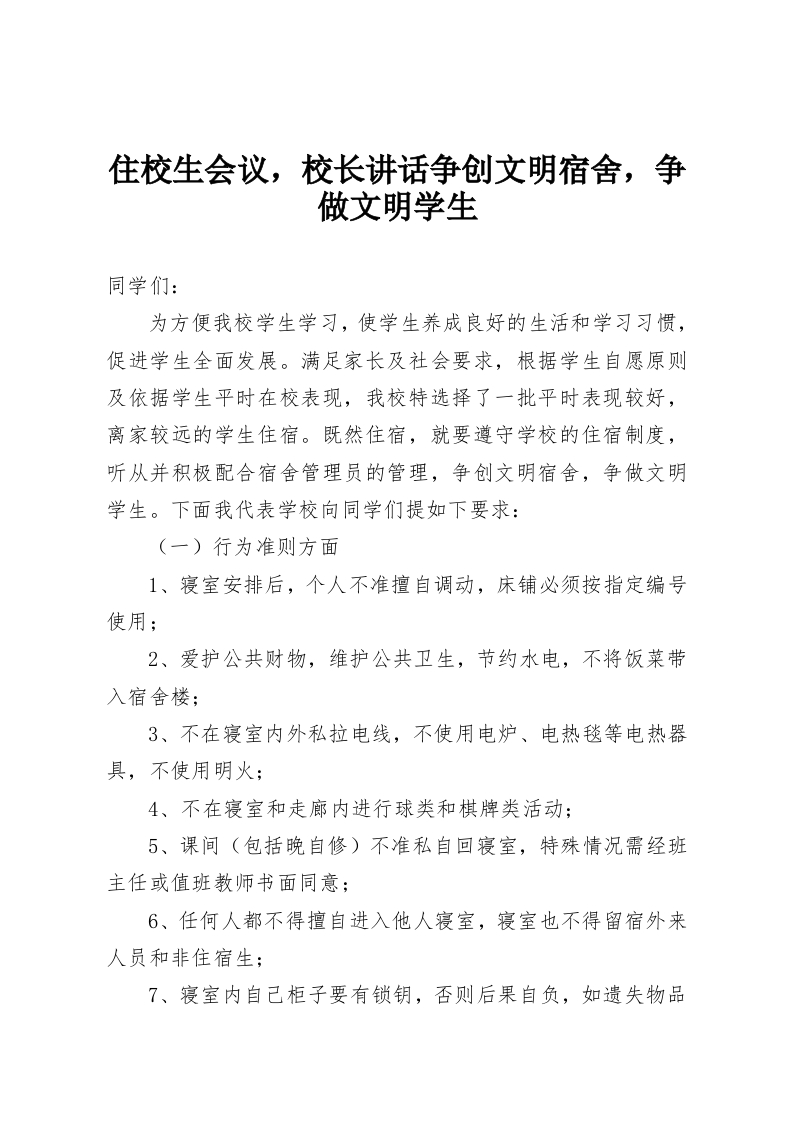 住校生会议,校长讲话争创文明宿舍,争做文明学生同学们:为方便我校学生学习,使学生养成良好的生活和学习习惯,促进学生全面发展。满足家长及社会要求,根据学生自愿原则及依据学生平时在校表现,我校特选择了一批平时表现较好,离家较远的学生住宿。既然住宿,就要遵守学校的住宿制度,听从并积极配合宿舍管理员的管理,争创文明宿舍,争做文明学生。下面我代表学校向同学们提如下要求:(一)行为准则方面1、寝室安排后,个人不准擅自调动,床铺必须按指定编号使用;2、爱护公共财物,维护公共卫生,节约水电,不将饭菜带入宿舍楼;3、不在寝室内外私拉电线,不使用电炉、电热毯等电热器具,不使用明火;4、不在寝室和走廊内进行球类和棋牌类活动;5、课间(包括晚自修)不准私自回寝室,特殊情况需经班主任或值班教师书面同意;6、任何人都不得擅自进入他人寝室,寝室也不得留宿外来人员和非住宿生;7、寝室内自己柜子要有锁钥,否则后果自负,如遗失物品