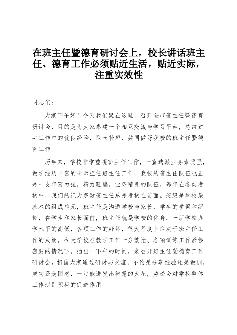 在班主任暨德育研讨会上,校长讲话班主任、德育工作必须贴近生活,贴近实际,注重实效性同志们:大家下午好!今天我们聚在这里,召开全市班主任暨德育研讨会,目的是为大家搭建一个相互交流与学习平台,总结过去工作中的优良经验,取长补短、共同做好我校的班主任暨德育工作。历年来,学校非常重视班主任工作,一直选派业务素质强,教学经历丰富的老师担任班主任工作,我校的班主任队伍也正是一支年富力强,精力旺盛,业务精良的队伍,每年在各类考核中,我们的绝大多数班主任总是考核在前面。班级是学校最基本的组成单元,班主任是沟通学校与家长、学生的桥梁和纽带,在学生和家长面前,班主任就是学校的化身。一所学校办学水平的高低,各项工作的好坏,很大程度上取决于班主任工作的成效。今天学校在教学工作十分繁忙、各项训练工作紧锣密鼓的情况下,抽出一下午的时间,来召开班主任暨德育工作研讨会。相信大家通过研讨与交流,不论是分享经验还是教训,成功还是困惑,一定能迸发出智慧的火花,势必会对学校整体工作起到积极的促进作用。