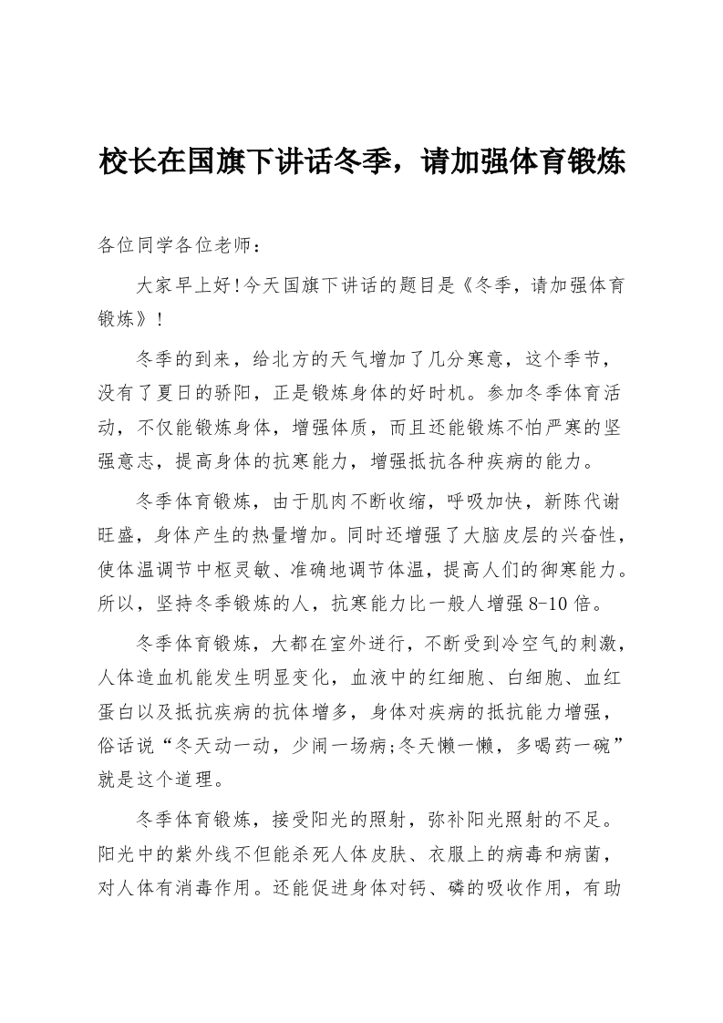 校长在国旗下讲话冬季,请加强体育锻炼各位同学各位老师:大家早上好!今天国旗下讲话的题目是《冬季,请加强体育锻炼》!冬季的到来,给北方的天气增加了几分寒意,这个季节,没有了夏日的骄阳,正是锻炼身体的好时机。参加冬季体育活动,不仅能锻炼身体,增强体质,而且还能锻炼不怕严寒的坚强意志,提高身体的抗寒能力,增强抵抗各种疾病的能力。冬季体育锻炼,由于肌肉不断收缩,呼吸加快,新陈代谢旺盛,身体产生的热量增加。同时还增强了大脑皮层的兴奋性,使体温调节中枢灵敏、准确地调节体温,提高人们的御寒能力。所以,坚持冬季锻炼的人,抗寒能力比一般人增强8-10倍。冬季体育锻炼,大都在室外迸行,不断受到冷空气的刺激,人体造血机能发生明显变化,血液中的红细胞、白细胞、血红蛋白以及抵抗疾病的抗体增多,身体对疾病的抵抗能力增强,俗话说“冬天动一动,少闹一场病;冬天懒一懒,多喝药一碗”就是这个道理。冬季体育锻炼,接受阳光的照射,弥补阳光照射的不足。阳光中的紫外线不但能杀死人体皮肤、衣服上的病毒和病菌,对人体有消毒作用。还能促进身体对钙、磷的吸收作用,有助