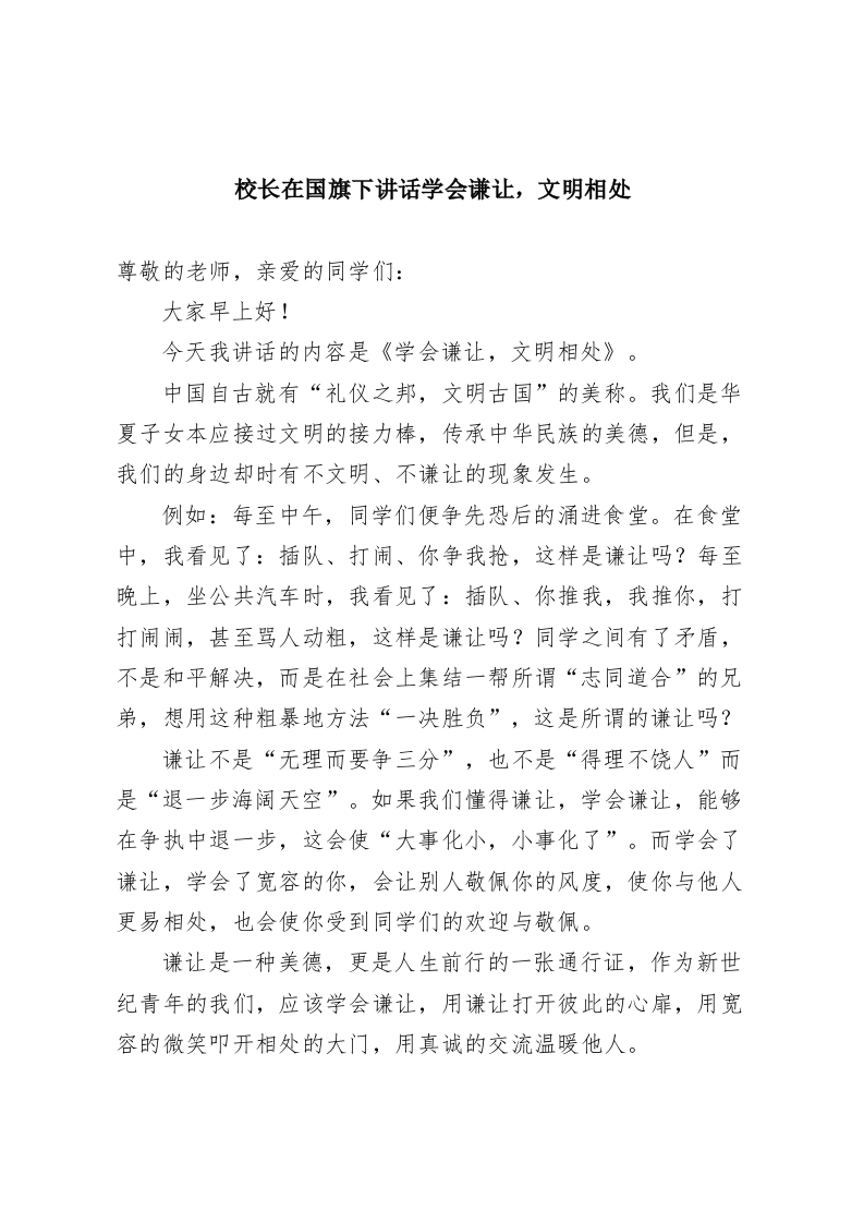校长在国旗下讲话学会谦让,文明相处尊敬的老师,亲爱的同学们:大家早上好!今天我讲话的内容是《学会谦让,文明相处》。中国自古就有“礼仪之邦,文明古国”的美称。我们是华夏子女本应接过文明的接力棒,传承中华民族的美德,但是,我们的身边却时有不文明、不谦让的现象发生。例如:每至中午,同学们便争先恐后的涌进食堂。在食堂中,我看见了:插队、打闹、你争我抢,这样是谦让吗?每至晚上,坐公共汽车时,我看见了:插队、你推我,我推你,打打闹闹,甚至骂人动粗,这样是谦让吗?同学之间有了矛盾,不是和平解决,而是在社会上集结一帮所谓“志同道合”的兄弟,想用这种粗暴地方法“一决胜负”,这是所谓的谦让吗?谦让不是“无理而要争三分”,也不是“得理不饶人”而是“退一步海阔天空”。如果我们懂得谦让,学会谦让,能够在争执中退一步,这会使“大事化小,小事化了”。而学会了谦让,学会了宽容的你,会让别人敬佩你的风度,使你与他人更易相处,也会使你受到同学们的欢迎与敬佩。谦让是一种美德,更是人生前行的一张通行证,作为新世纪青年的我们,应该学会谦让,用谦让打开彼此的心扉,用宽容的微笑叩开相处的大门,用真诚的交流温暖他人。