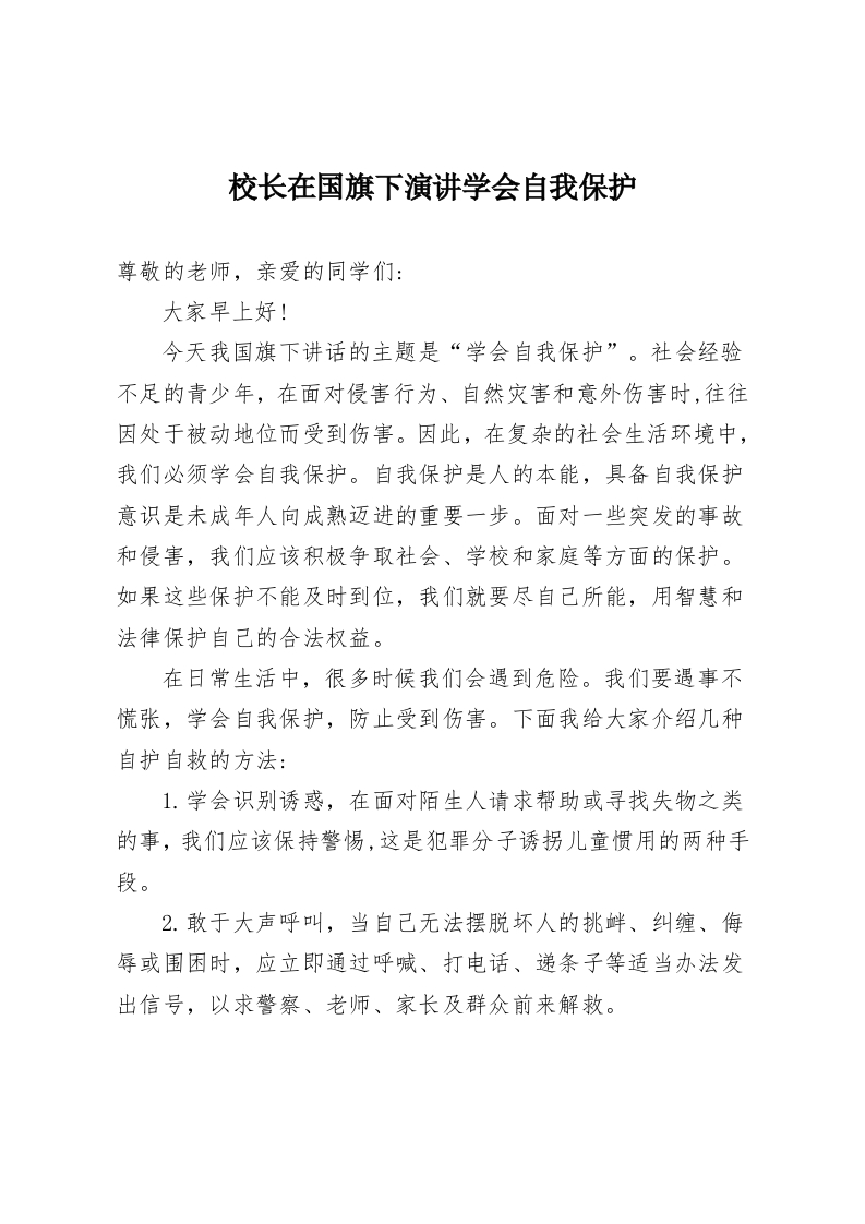 校长在国旗下演讲学会自我保护尊敬的老师,亲爱的同学们:大家早上好!今天我国旗下讲话的主题是“学会自我保护”。社会经验不足的青少年,在面对侵害行为、自然灾害和意外伤害时,往往因处于被动地位而受到伤害。因此,在复杂的社会生活环境中,我们必须学会自我保护。自我保护是人的本能,具备自我保护意识是未成年人向成熟迈进的重要一步。面对一些突发的事故和侵害,我们应该积极争取社会、学校和家庭等方面的保护。如果这些保护不能及时到位,我们就要尽自己所能,用智慧和法律保护自己的合法权益。在日常生活中,很多时候我们会遇到危险。我们要遇事不慌张,学会自我保护,防止受到伤害。下面我给大家介绍几种自护自救的方法:1.学会识别诱惑,在面对陌生人请求帮助或寻找失物之类的事,我们应该保持警惕,这是犯罪分子诱拐儿童惯用的两种手段。2.敢于大声呼叫,当自己无法摆脱坏人的挑衅、纠缠、侮辱或围困时,应立即通过呼喊、打电话、递条子等适当办法发出信号,以求警察、老师、家长及群众前来解救。