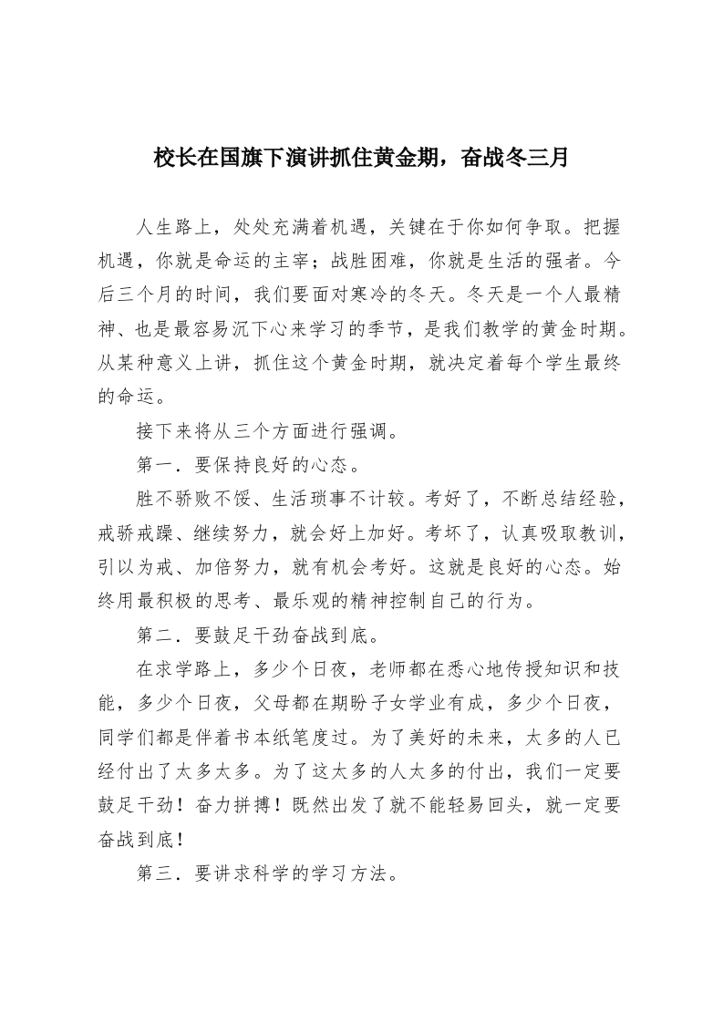 校长在国旗下演讲抓住黄金期,奋战冬三月人生路上,处处充满着机遇,关键在于你如何争取。把握机遇,你就是命运的主宰;战胜困难,你就是生活的强者。今后三个月的时间,我们要面对寒冷的冬天。冬天是一个人最精神、也是最容易沉下心来学习的季节,是我们教学的黄金时期。从某种意义上讲,抓住这个黄金时期,就决定着每个学生最终的命运。接下来将从三个方面进行强调。第一,要保持良好的心态。胜不骄败不馁、生活琐事不计较。考好了,不断总结经验,戒骄戒躁、继续努力,就会好上加好。考坏了,认真吸取教训,引以为戒、加倍努力,就有机会考好。这就是良好的心态。始终用最积极的思考、最乐观的精神控制自己的行为。第二.要鼓足干劲奋战到底。在求学路上,多少个日夜,老师都在悉心地传授知识和技能,多少个日夜,父母都在期盼子女学业有成,多少个日夜,同学们都是伴着书本纸笔度过。为了美好的未来,太多的人已经付出了太多太多。为了这太多的人太多的付出,我们一定要鼓足干劲!奋力拼搏!既然出发了就不能轻易回头,就一定要奋战到底!第三.要讲求科学的学习方法。