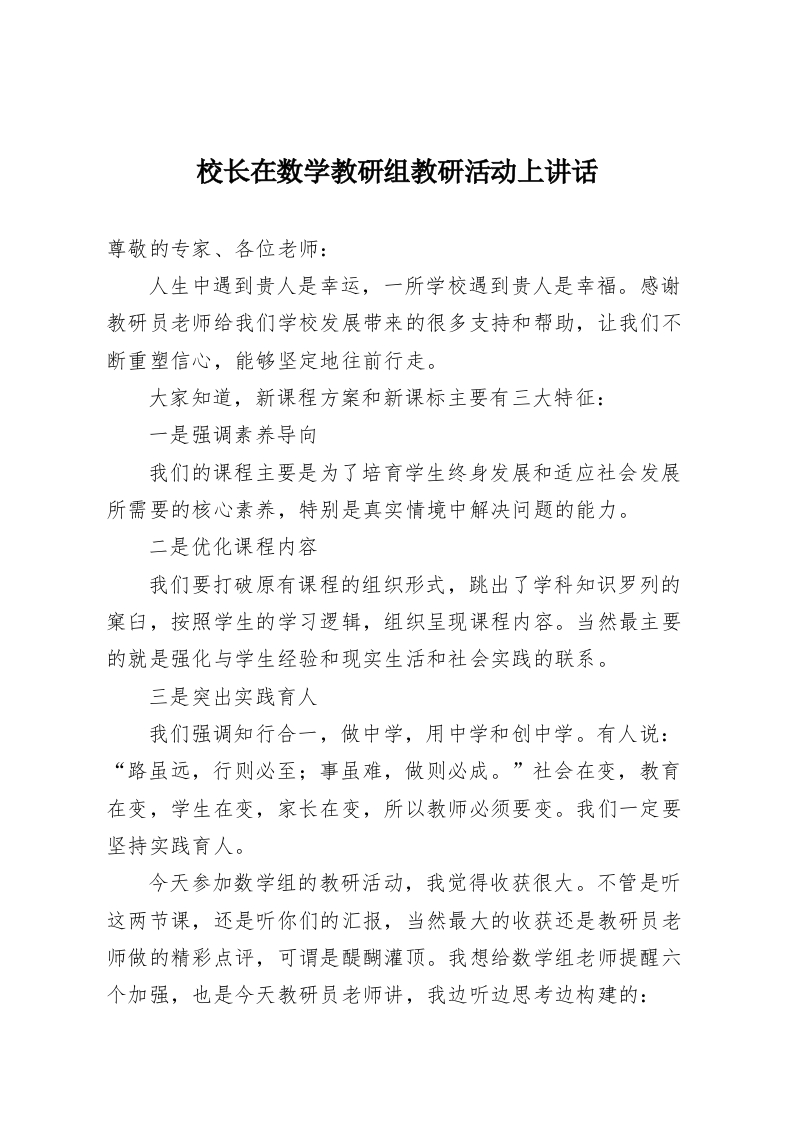 校长在数学教研组教研活动上讲话尊敬的专家、各位老师:人生中遇到贵人是幸运,一所学校遇到贵人是幸福。感谢教研员老师给我们学校发展带来的很多支持和帮助,让我们不断重塑信心,能够坚定地往前行走。大家知道,新课程方案和新课标主要有三大特征:一是强调素养导向我们的课程主要是为了培育学生终身发展和适应社会发展所需要的核心素养,特别是真实情境中解决问题的能力。二是优化课程内容我们要打破原有课程的组织形式,跳出了学科知识罗列的窠臼,按照学生的学习逻辑,组织呈现课程内容。当然最主要的就是强化与学生经验和现实生活和社会实践的联系。三是突出实践育人我们强调知行合一,做中学,用中学和创中学。有人说:“路虽远,行则必至;事虽难,做则必成。”社会在变,教育在变,学生在变,家长在变,所以教师必须要变。我们一定要坚持实践育人。今天参加数学组的教研活动,我觉得收获很大。不管是听这两节课,还是听你们的汇报,当然最大的收获还是教研员老师做的精彩点评,可谓是醍醐灌顶。我想给数学组老师提醒六个加强,也是今天教研员老师讲,我边听边思考边构建的: