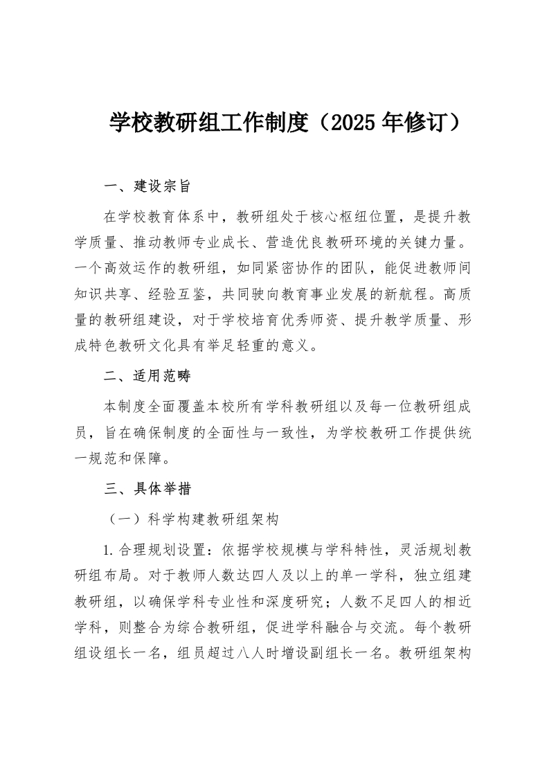 学校教研组工作制度(2025年修订)一、建设宗旨在学校教育体系中,教研组处于核心枢纽位置,是提升教学质量、推动教师专业成长、营造优良教研环境的关键力量。一个高效运作的教研组,如同紧密协作的团队,能促进教师间知识共享、经验互鉴,共同驶向教育事业发展的新航程。高质量的教研组建设,对于学校培育优秀师资、提升教学质量、形成特色教研文化具有举足轻重的意义。二、适用范畴本制度全面覆盖本校所有学科教研组以及每一位教研组成员,旨在确保制度的全面性与一致性,为学校教研工作提供统一规范和保障。三、具体举措(一)科学构建教研组架构1.合理规划设置:依据学校规模与学科特性,灵活规划教研组布局。对于教师人数达四人及以上的单一学科,独立组建教研组,以确保学科专业性和深度研究:人数不足四人的相近学科,则整合为综合教研组,促进学科融合与交流。每个教研组设组长一名,组员超过八人时增设副组长一名。教研组架构