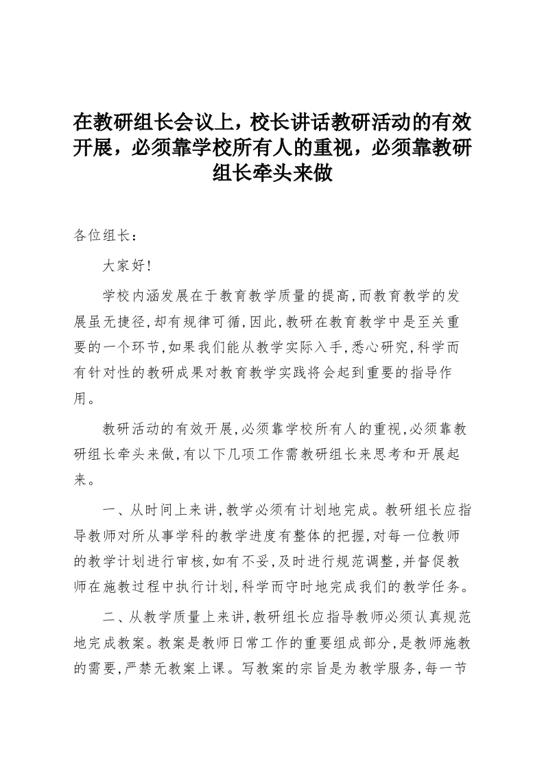 在教研组长会议上,校长讲话教研活动的有效开展,必须靠学校所有人的重视,必须靠教研组长牵头来做各位组长:大家好!学校内涵发展在于教育教学质量的提高,而教育教学的发展虽无捷径,却有规律可循,因此,教研在教育教学中是至关重要的一个环节,如果我们能从教学实际入手,悉心研究,科学而有针对性的教研成果对教育教学实践将会起到重要的指导作用。教研活动的有效开展,必须靠学校所有人的重视,必须靠教研组长牵头来做,有以下几项工作需教研组长来思考和开展起来。一、从时间上来讲,教学必须有计划地完成。教研组长应指导教师对所从事学科的教学进度有整体的把握,对每一位教师的教学计划进行审核,如有不妥,及时进行规范调整,并督促教师在施教过程中执行计划,科学而守时地完成我们的教学任务。二、从教学质量上来讲,教研组长应指导教师必须认真规范地完成教案。教案是教师日常工作的重要组成部分,是教师施教的需要,严禁无教案上课。写教案的宗旨是为教学服务,每一节
