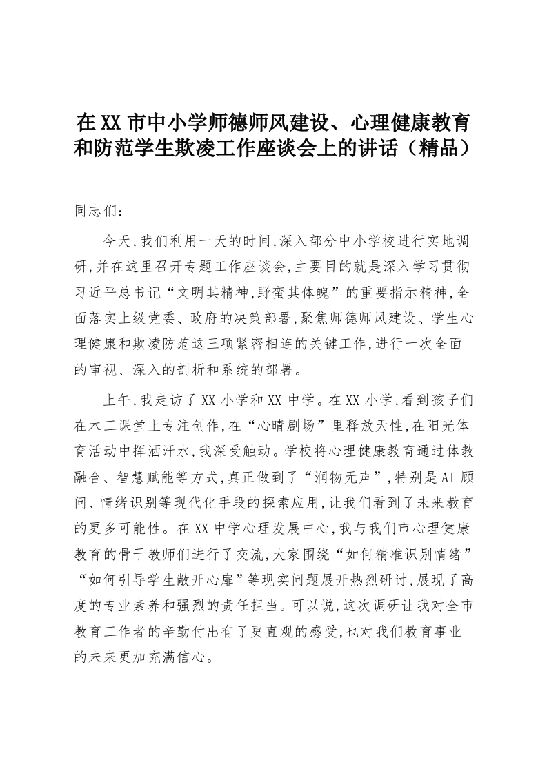 在巡市中小学师德师风建设、心理健康教育和防范学生欺凌工作座谈会上的讲话(精品)同志们:今天,我们利用一天的时间,深入部分中小学校进行实地调研,并在这里召开专题工作座谈会,主要目的就是深入学习贯彻习近平总书记“文明其精神,野蛮其体魄”的重要指示精神,全面落实上级党委、政府的决策部署,聚焦师德师风建设、学生心理健康和欺凌防范这三项紧密相连的关键工作,进行一次全面的审视、深入的剖析和系统的部署。上午,我走访了XX小学和XX中学。在XX小学,看到孩子们在木工课堂上专注创作,在“心晴剧场”里释放天性,在阳光体育活动中挥洒汗水,我深受触动。学校将心理健康教育通过体教融合、智慧赋能等方式,真正做到了“润物无声”,特别是AI顾问、情绪识别等现代化手段的探索应用,让我们看到了未来教育的更多可能性。在XX中学心理发展中心,我与我们市心理健康教育的骨干教师们进行了交流,大家围绕“如何精准识别情绪”“如何引导学生敞开心扉”等现实问题展开热烈研讨,展现了高度的专业素养和强烈的责任担当。可以说,这次调研让我对全市教育工作者的辛勤付出有了更直观的感受,也对我们教育事业的未来更加充满信心。