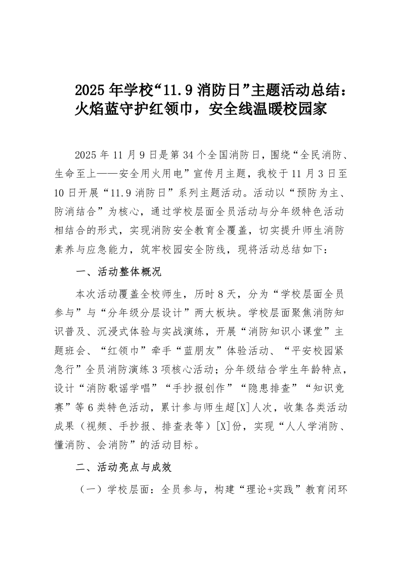 2025年学校“11.9消防日”主题活动总结:火焰蓝守护红领巾,安全线温暖校园家2025年11月9日是第34个全国消防日,围绕“全民消防、生命至上一一安全用火用电”宣传月主题,我校于11月3日至10日开展“11.9消防日”系列主题活动。活动以“预防为主、防消结合”为核心,通过学校层面全员活动与分年级特色活动相结合的形式,实现消防安全教育全覆盖,切实提升师生消防素养与应急能力,筑牢校园安全防线,现将活动总结如下:一、活动整体概况本次活动覆盖全校师生,历时8天,分为“学校层面全员参与”与“分年级分层设计”两大板块。学校层面聚焦消防知识普及、沉浸式体验与实战演练,开展“消防知识小课堂”主题班会、“红领巾”牵手“蓝朋友”体验活动、“平安校园紧急行”全员消防演练3项核心活动;分年级结合学生年龄特点,设计“消防歌谣学唱”“手抄报创作”“隐患排查”“知识竞赛”等6类特色活动,累计参与师生超[X]人次,收集各类活动成果(视频、手抄报、排查表等)[X]份,实现“人人学消防、懂消防、会消防”的活动目标。二、活动亮点与成效(一)学校层面:全员参与,构建“理论+实践”教育闭环