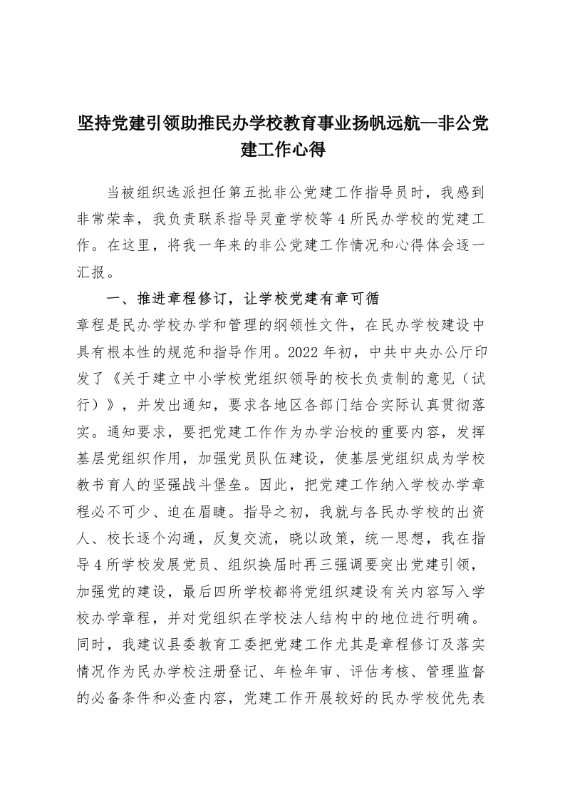 坚持党建引领助推民办学校教育事业扬帆远航一非公党建工作心得当被组织选派担任第五批非公党建工作指导员时,我感到非常荣幸,我负责联系指导灵童学校等4所民办学校的党建工作。在这里,将我一年来的非公党建工作情况和心得体会逐一汇报。一、推进章程修订,让学校党建有章可循章程是民办学校办学和管理的纲领性文件,在民办学校建设中具有根本性的规范和指导作用。2022年初,中共中央办公厅印发了《关于建立中小学校党组织领导的校长负责制的意见(试行)》,并发出通知,要求各地区各部门结合实际认真贯彻落实。通知要求,要把党建工作作为办学治校的重要内容,发挥基层党组织作用,加强党员队伍建设,使基层党组织成为学校教书育人的坚强战斗堡垒。因此,把党建工作纳入学校办学章程必不可少、迫在眉睫。指导之初,我就与各民办学校的出资人、校长逐个沟通,反复交流,晓以政策,统一思想,我在指导4所学校发展党员、组织换届时再三强调要突出党建引领,加强党的建设,最后四所学校都将党组织建设有关内容写入学校办学章程,并对党组织在学校法人结构中的地位进行明确。同时,我建议县委教育工委把党建工作尤其是章程修订及落实情况作为民办学校注册登记、年检年审、评估考核、管理监督的必备条件和必查内容,党建工作开展较好的民办学校优先表