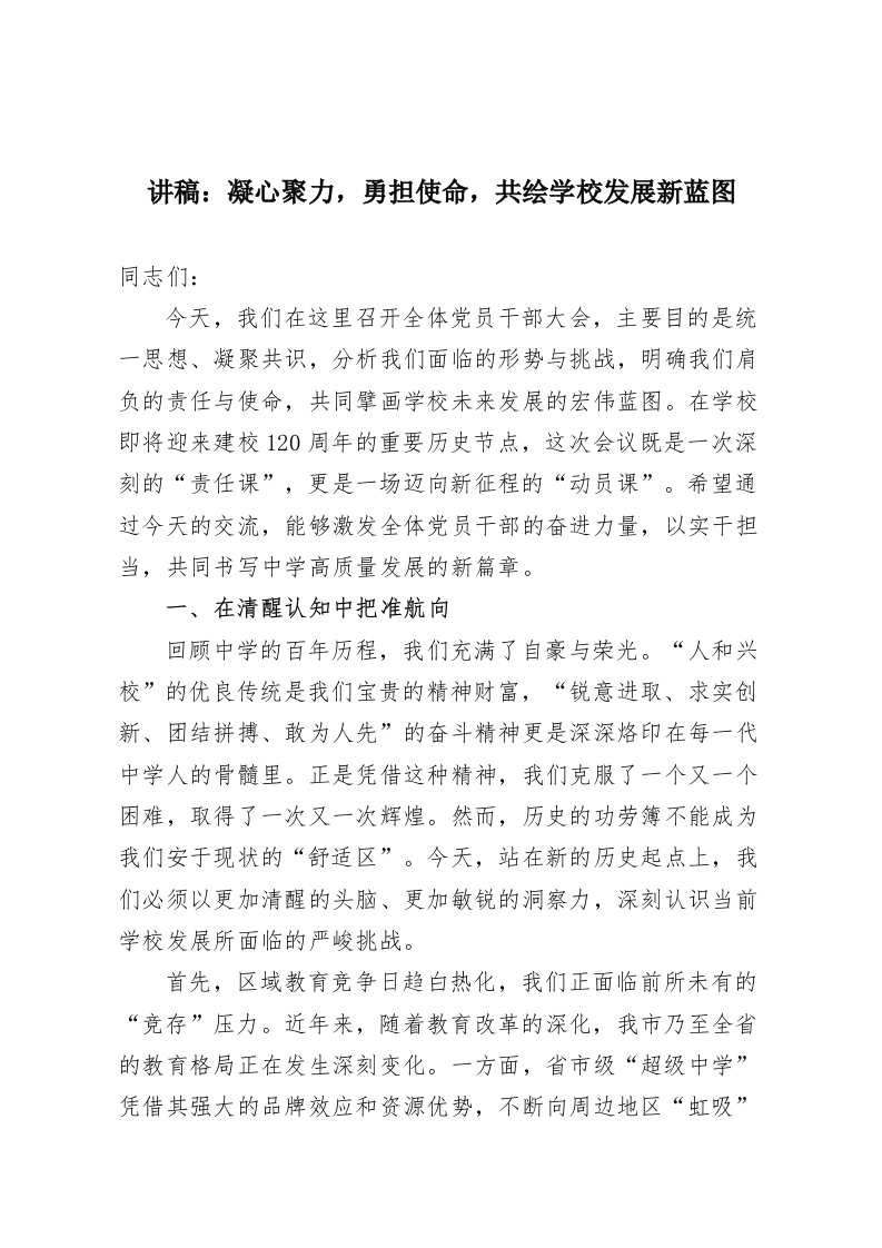 讲稿:凝心聚力,勇担使命,共绘学校发展新蓝图同志们:今天,我们在这里召开全体党员干部大会,主要目的是统一思想、凝聚共识,分析我们面临的形势与挑战,明确我们肩负的责任与使命,共同擘画学校未来发展的宏伟蓝图。在学校即将迎来建校120周年的重要历史节点,这次会议既是一次深刻的“责任课”,更是一场迈向新征程的“动员课”。希望通过今天的交流,能够激发全体党员干部的奋进力量,以实干担当,共同书写中学高质量发展的新篇章。一、在清醒认知中把准航向回顾中学的百年历程,我们充满了自豪与荣光。“人和兴校”的优良传统是我们宝贵的精神财富,“锐意进取、求实创新、团结拼搏、敢为人先”的奋斗精神更是深深烙印在每一代中学人的骨髓里。正是凭借这种精神,我们克服了一个又一个困难,取得了一次又一次辉煌。然而,历史的功劳簿不能成为我们安于现状的“舒适区”。今天,站在新的历史起点上,我们必须以更加清醒的头脑、更加敏锐的洞察力,深刻认识当前学校发展所面临的严峻挑战。首先,区域教育竞争日趋白热化,我们正面临前所未有的“竞存”压力。近年来,随着教育改革的深化,我市乃至全省的教育格局正在发生深刻变化。一方面,省市级“超级中学”凭借其强大的品牌效应和资源优势,不断向周边地区“虹吸”