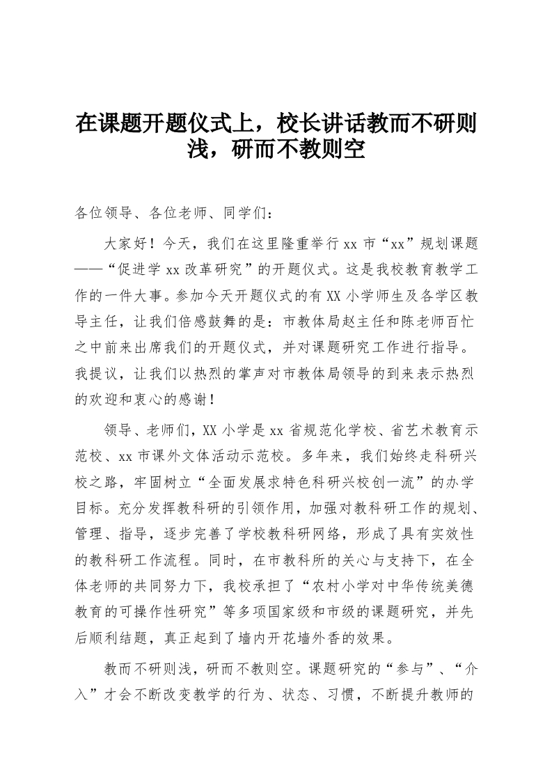 在课题开题仪式上,校长讲话教而不研则浅,研而不教则空各位领导、各位老师、同学们:大家好!今天,我们在这里隆重举行xx市“xx”规划课题“促进学xx改革研究”的开题仪式。这是我校教育教学工作的一件大事。参加今天开题仪式的有X小学师生及各学区教导主任,让我们倍感鼓舞的是:市教体局赵主任和陈老师百忙之中前来出席我们的开题仪式,并对课题研究工作进行指导。我提议,让我们以热烈的掌声对市教体局领导的到来表示热烈的欢迎和衷心的感谢!领导、老师们,XX小学是xx省规范化学校、省艺术教育示范校、Xx市课外文体活动示范校。多年来,我们始终走科研兴校之路,牢固树立“全面发展求特色科研兴校创一流”的办学目标。充分发挥教科研的引领作用,加强对教科研工作的规划、管理、指导,逐步完善了学校教科研网络,形成了具有实效性的教科研工作流程。同时,在市教科所的关心与支持下,在全体老师的共同努力下,我校承担了“农村小学对中华传统美德教育的可操作性研究”等多项国家级和市级的课题研究,并先后顺利结题,真正起到了墙内开花墙外香的效果。教而不研则浅,研而不教则空。课题研究的“参与”、“介入”才会不断改变教学的行为、状态、习惯,不断提升教师的