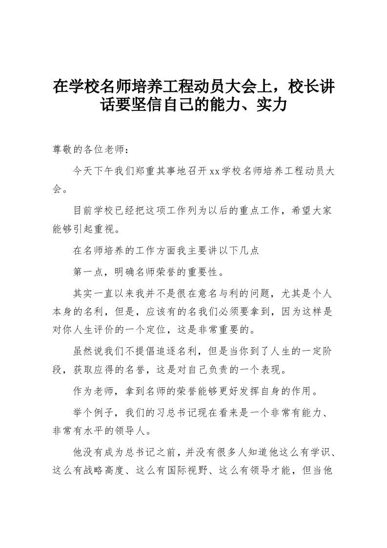 在学校名师培养工程动员大会上,校长讲话要坚信自己的能力、实力尊敬的各位老师:今天下午我们郑重其事地召开xx学校名师培养工程动员大会。目前学校已经把这项工作列为以后的重点工作,希望大家能够引起重视。在名师培养的工作方面我主要讲以下几点第一点,明确名师荣誉的重要性。其实一直以来我并不是很在意名与利的问题,尤其是个人本身的名利,但是,应该有的名我们必须要拿到,因为这样是对你人生评价的一个定位,这是非常重要的。虽然说我们不提倡追逐名利,但是当你到了人生的一定阶段,获取应得的名誉,这是对自己负责的一个表现。作为老师,拿到名师的荣誉能够更好发挥自身的作用。举个例子,我们的习总书记现在看来是一个非常有能力、非常有水平的领导人。他没有成为总书记之前,并没有很多人知道他这么有学识、这么有战略高度、这么有国际视野、这么有领导才能,但当他