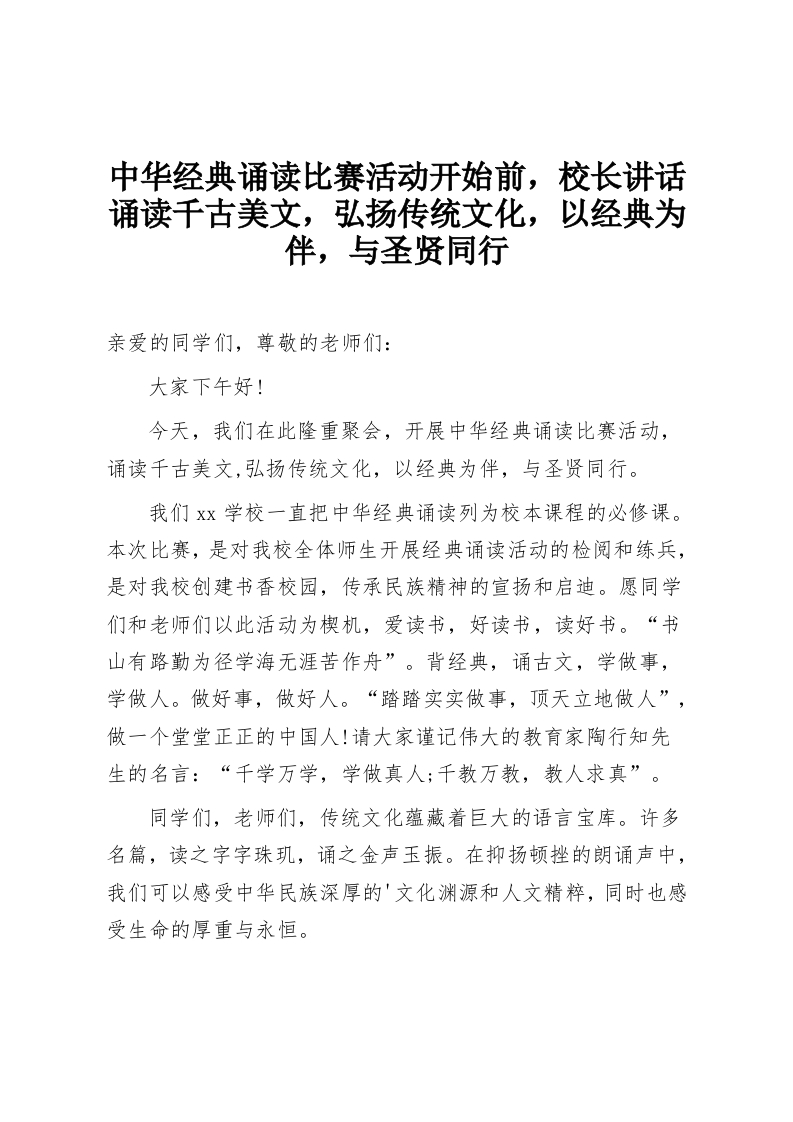 中华经典诵读比赛活动开始前,校长讲话诵读千古美文,弘扬传统文化,以经典为伴,与圣贤同行亲爱的同学们,尊敬的老师们:大家下午好!今天,我们在此隆重聚会,开展中华经典诵读比赛活动,诵读千古美文,弘扬传统文化,以经典为伴,与圣贤同行。我们xx学校一直把中华经典诵读列为校本课程的必修课。本次比赛,是对我校全体师生开展经典诵读活动的检阅和练兵,是对我校创建书香校园,传承民族精神的宣扬和启迪。愿同学们和老师们以此活动为楔机,爱读书,好读书,读好书。“书山有路勤为径学海无涯苦作舟”。背经典,诵古文,学做事,学做人。做好事,做好人。“踏踏实实做事,顶天立地做人”,做一个堂堂正正的中国人!请大家谨记伟大的教育家陶行知先生的名言:“千学万学,学做真人;千教万教,教人求真”。同学们,老师们,传统文化蕴藏着巨大的语言宝库。许多名篇,读之字字珠玑,诵之金声玉振。在抑扬顿挫的朗诵声中,我们可以感受中华民族深厚的'文化渊源和人文精粹,同时也感受生命的厚重与永恒。