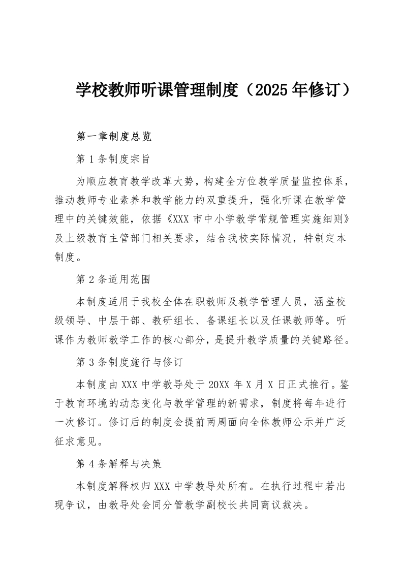 学校教师听课管理制度(2025年修订)第一章制度总览第1条制度宗旨为顺应教育教学改革大势,构建全方位教学质量监控体系,推动教师专业素养和教学能力的双重提升,强化听课在教学管理中的关键效能,依据《XXX市中小学教学常规管理实施细则》及上级教育主管部门相关要求,结合我校实际情况,特制定本制度。第2条适用范围本制度适用于我校全体在职教师及教学管理人员,涵盖校级领导、中层干部、教研组长、备课组长以及任课教师等。听课作为教师教学工作的核心部分,是提升教学质量的关键路径。第3条制度施行与修订本制度由XXX中学教导处于20XX年X月X日正式推行。鉴于教育环境的动态变化与教学管理的新需求,制度将每年进行一次修订。修订后的制度会提前两周面向全体教师公示并广泛征求意见。第4条解释与决策本制度解释权归XXX中学教导处所有。在执行过程中若出现争议,由教导处会同分管教学副校长共同商议裁决。