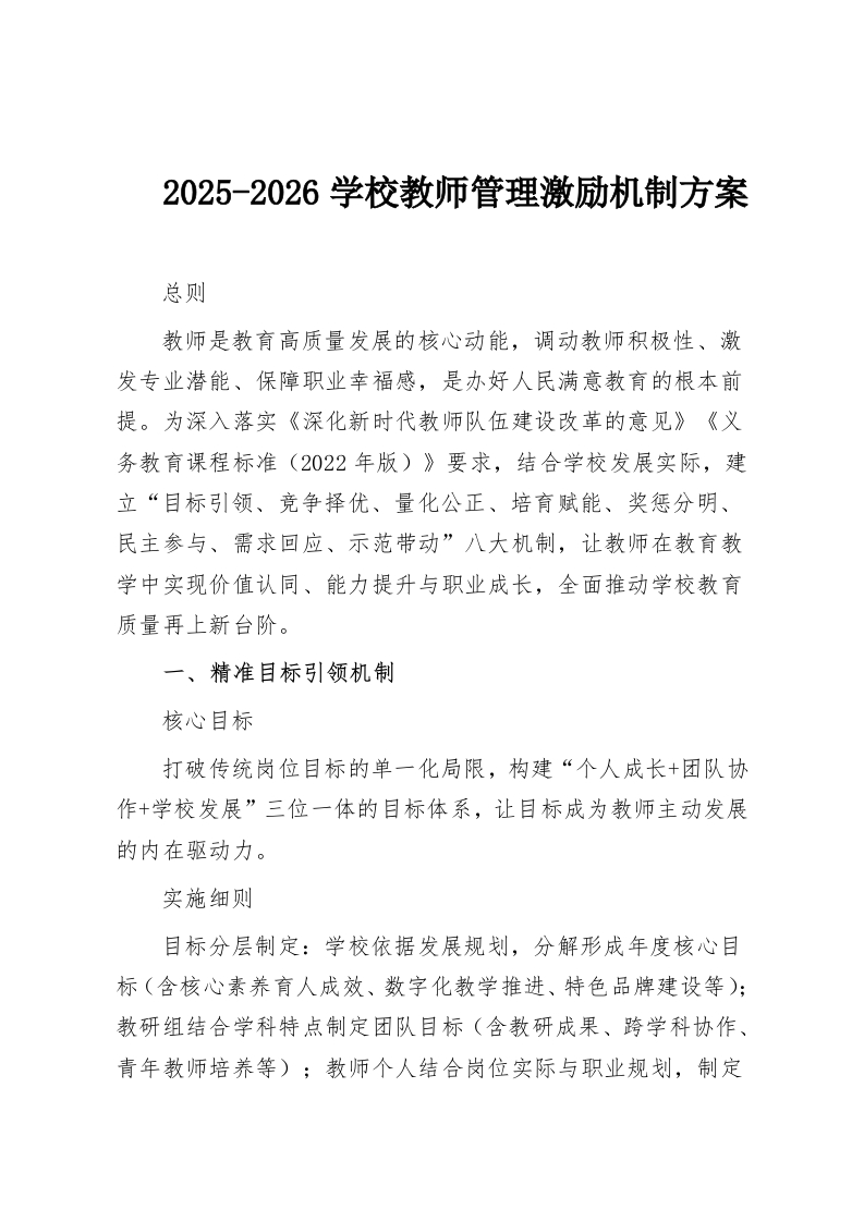 2025-2026学校教师管理激励机制方案总则教师是教育高质量发展的核心动能,调动教师积极性、激发专业潜能、保障职业幸福感,是办好人民满意教育的根本前提。为深入落实《深化新时代教师队伍建设改革的意见》《义务教育课程标准(2022年版)》要求,结合学校发展实际,建立“目标引领、竞争择优、量化公正、培育赋能、奖惩分明、民主参与、需求回应、示范带动”八大机制,让教师在教育教学中实现价值认同、能力提升与职业成长,全面推动学校教育质量再上新台阶。一、精准目标引领机制核心目标打破传统岗位目标的单一化局限,构建“个人成长+团队协作+学校发展”三位一体的目标体系,让目标成为教师主动发展的内在驱动力。实施细则目标分层制定:学校依据发展规划,分解形成年度核心目标(含核心素养育人成效、数字化教学推进、特色品牌建设等):教研组结合学科特点制定团队目标(含教研成果、跨学科协作、青年教师培养等);教师个人结合岗位实际与职业规划,制定