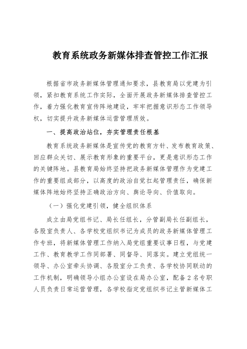 教育系统政务新媒体排查管控工作汇报根据省市政务新媒体管理通知要求,县教育局以党建为引领,紧扣教育系统工作实际,全面开展政务新媒体排查管控工作,着力强化教育宣传阵地建设,牢牢把握意识形态工作领导权,切实提升政务新媒体运营管理质效。一、提高政治站位,夯实管理责任根基教育系统政务新媒体是宣传党的教育方针、发布教育政策、回应群众关切、展示教育形象的重要平台,更是意识形态工作的关键阵地。县教育局始终坚持把政务新媒体管理作为党建工作的重要组成部分,以高度的政治自觉扛起管理责任,确保新媒体阵地始终坚持正确政治方向、舆论导向、价值取向。(一)强化党建引领,健全组织体系成立由局党组书记、局长任组长,分管副局长任副组长,各股室负责人、各学校党组织书记为成员的政务新媒体管理工作专班,将新媒体管理工作纳入局党组重要议事日程,与党建工作、教育教学工作同部署、同督导、同落实。建立党组统一领导、办公室牵头协调、各股室分工负责、各学校协同联动的工作机制,明确领导小组办公室设在局办公室,配备2名专职人员负责日常运营管理,各学校指定党组织书记主管新媒体工