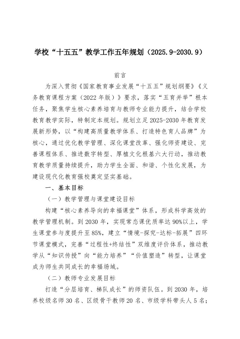 学校“十五五”教学工作五年规划(2025.9-2030.9)前言为深入贯彻《国家教育事业发展“十五五”规划纲要》《义务教育课程方案(2022年版)》要求,落实“五育并举”根本任务,聚焦学生核心素养培育与教师专业能力提升,结合学校教育教学实际,特制定本规划。规划立足2025-2030年教育发展新形势,以“构建高质量教学体系、打造特色育人品牌”为核心,通过优化教学管理、深化课堂改革、强化师资建设、完善课程体系、推进数字转型、厚植文化根基六大行动,推动教育教学质量持续提升,助力学生全面、和谐、个性化发展,为建设现代化教育强校奠定坚实基础。一、基本目标(一)教学管理与课堂建设目标构建“核心素养导向的幸福课堂”体系,形成科学高效的教学管理机制。到2030年,实现常态课优质率达90%以上,学生课堂参与度提升至85%,建立“情境-探究-达标-拓展”四环节课堂模式,完善“过程性+终结性”双维度评价体系,推动教学从“知识传授”向“能力培养”“价值塑造”转型,让课堂成为师生共同成长的幸福场域。(二)教师专业发展目标打造“分层培育、梯队成长”的师资队伍。到2030年,培养校级名师30名、区级骨干教师20名、市级学科带头人5名;