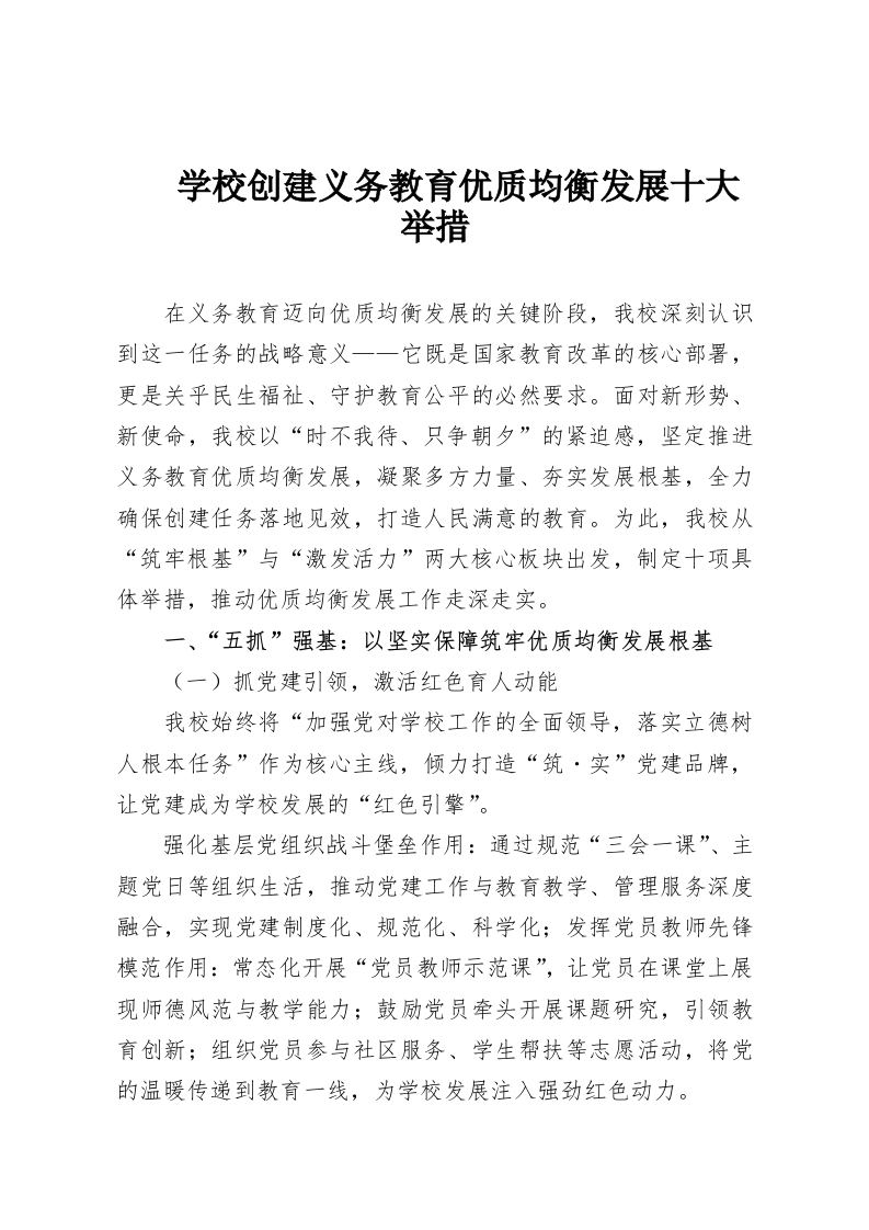 学校创建义务教育优质均衡发展十大举措在义务教育迈向优质均衡发展的关键阶段,我校深刻认识到这一任务的战略意义一一它既是国家教育改革的核心部署,更是关乎民生福祉、守护教育公平的必然要求。面对新形势、新使命,我校以“时不我待、只争朝夕”的紧迫感,坚定推进义务教育优质均衡发展,凝聚多方力量、夯实发展根基,全力确保创建任务落地见效,打造人民满意的教育。为此,我校从“筑牢根基”与“激发活力”两大核心板块出发,制定十项具体举措,推动优质均衡发展工作走深走实。一、“五抓”强基:以坚实保障筑牢优质均衡发展根基(一)抓党建引领,激活红色育人动能我校始终将“加强党对学校工作的全面领导,落实立德树人根本任务”作为核心主线,倾力打造“筑·实”党建品牌,让党建成为学校发展的“红色引擎”。强化基层党组织战斗堡垒作用:通过规范“三会一课”、主题党日等组织生活,推动党建工作与教育教学、管理服务深度融合,实现党建制度化、规范化、科学化;发挥党员教师先锋模范作用:常态化开展“党员教师示范课”,让党员在课堂上展现师德风范与教学能力;鼓励党员牵头开展课题研究,引领教育创新;组织党员参与社区服务、学生帮扶等志愿活动,将党的温暖传递到教育一线,为学校发展注入强劲红色动力。