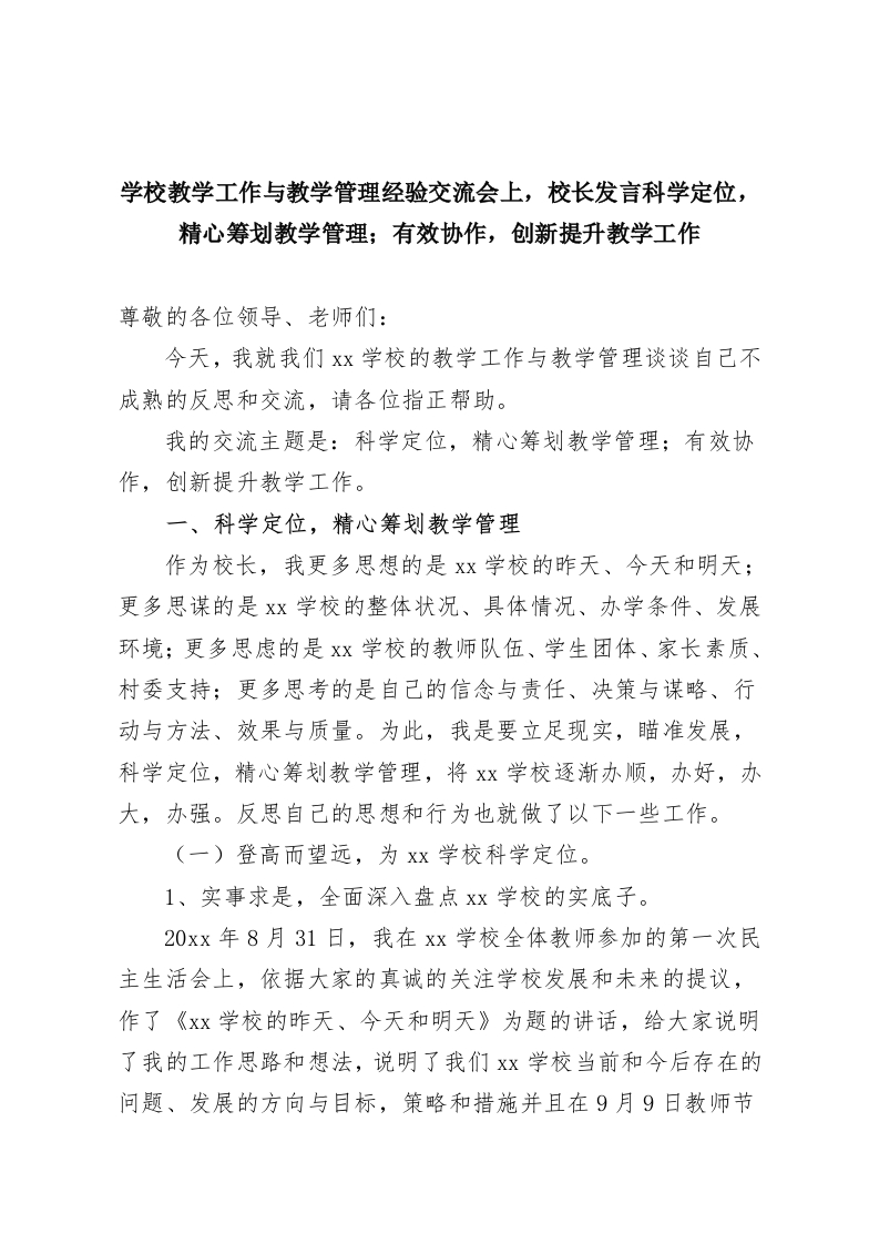 学校教学工作与教学管理经验交流会上,校长发言科学定位,精心筹划教学管理;有效协作,创新提升教学工作尊敬的各位领导、老师们:今天,我就我们xx学校的教学工作与教学管理谈谈自己不成熟的反思和交流,请各位指正帮助。我的交流主题是:科学定位,精心筹划教学管理;有效协作,创新提升教学工作。一、科学定位,精心筹划教学管理作为校长,我更多思想的是Xx学校的昨天、今天和明天;更多思谋的是xx学校的整体状况、具体情况、办学条件、发展环境;更多思虑的是xx学校的教师队伍、学生团体、家长素质、村委支持;更多思考的是自己的信念与责任、决策与谋略、行动与方法、效果与质量。为此,我是要立足现实,瞄准发展,科学定位,精心筹划教学管理,将Xx学校逐渐办顺,办好,办大,办强。反思自己的思想和行为也就做了以下一些工作。(一)登高而望远,为xx学校科学定位。1、实事求是,全面深入盘点Xx学校的实底子。20xx年8月31日,我在xx学校全体教师参加的第一次民主生活会上,依据大家的真诚的关注学校发展和未来的提议,作了《xx学校的昨天、今天和明天》为题的讲话,给大家说明了我的工作思路和想法,说明了我们Xx学校当前和今后存在的问题、发展的方向与目标,策略和措施并且在9月9日教师节