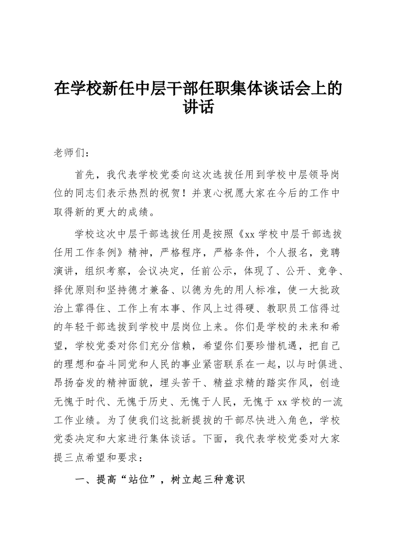 在学校新任中层干部任职集体谈话会上的讲话老师们:首先,我代表学校党委向这次选拔任用到学校中层领导岗位的同志们表示热烈的祝贺!并衷心祝愿大家在今后的工作中取得新的更大的成绩。学校这次中层干部选拔任用是按照《xx学校中层干部选拔任用工作条例》精神,严格程序,严格条件,个人报名,竞聘演讲,组织考察,会议决定,任前公示,体现了、公开、竞争、择优原则和坚持德才兼备、以德为先的用人标准,使一大批政治上霏得住、工作上有本事、作风上过得硬、教职员工信得过的年轻干部选拔到学校中层岗位上来。你们是学校的未来和希望,学校党委对你们充分信赖,希望你们要珍惜机遇,把自己的理想和奋斗同党和人民的事业紧密联系在一起,以与时俱进、昂扬奋发的精神面貌,埋头苦干、精益求精的踏实作风,创造无愧于时代、无愧于历史、无愧于人民,无愧于Xx学校的一流工作业绩。为了使我们这批新提拔的干部尽快进入角色,学校党委决定和大家进行集体谈话。下面,我代表学校党委对大家提三点希望和要求:一、提高“站位”,树立起三种意识