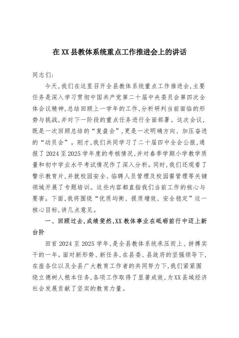 在XX县教体系统重点工作推进会上的讲话同志们:今天,我们在这里召开全县教体系统重点工作推进会,主要任务是深入学习贯彻中国共产党第二十届中央委员会第四次全体会议精神,总结回顾上一学年的工作,分析研判当前面临的形势与挑战,并对下一阶段的重点任务进行全面部署。这次会议,既是一次回顾总结的“复盘会”,更是一次明确方向、加压奋进的“动员会”。刚才,我们共同学习了二十届四中全会公报,通报了2024至2025学年度的考核情况,并对春季学期小学教学质量和初中学业水平考试情况作了深入分析。同时,我们还观看了警示教育片,并就校园安全、临聘人员管理及校园餐管理等关键领域开展了专题培训。这些内容都直指我们当前工作的核心与要害。下面,我将围绕“优质均衡、提质增效、安全稳定”这一核心目标,讲几点意见。一、回顾过去,成绩斐然,XX教体事业在砥砺前行中迈上新台阶回首2024至2025学年,是全县教体系统承压而上、拼搏实干的一年。面对新形势、新任务,在县委、县政府的坚强领导下,在座各位以及全县广大教育工作者的共同努力下,我们紧紧围绕立德树人根本任务,各项工作取得了显著成效,为XX县域经济社会发展贡献了坚实的教育力量。