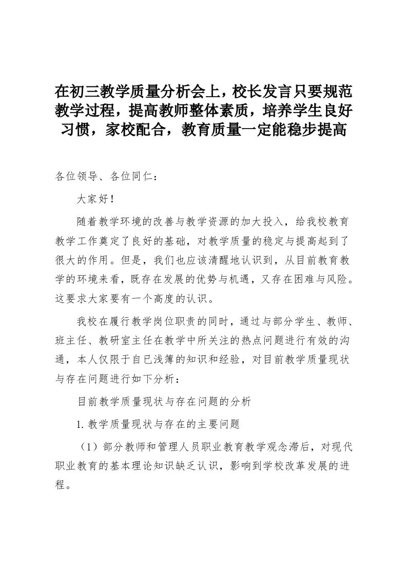 在初三教学质量分析会上,校长发言只要规范教学过程,提高教师整体素质,培养学生良好习惯,家校配合,教育质量一定能稳步提高各位领导、各位同仁:大家好!随着教学环境的改善与教学资源的加大投入,给我校教育教学工作奠定了良好的基础,对教学质量的稳定与提高起到了很大的作用。但是,我们也应该清醒地认识到,从目前教育教学的环境来看,既存在发展的优势与机遇,又存在困难与风险。这要求大家要有一个高度的认识。我校在履行教学岗位职责的同时,通过与部分学生、教师、班主任、教研室主任在教学中所关注的热点问题进行有效的沟通,本人仅限于自已浅簿的知识和经验,对目前教学质量现状与存在问题进行如下分析:目前教学质量现状与存在问题的分析1.教学质量现状与存在的主要问题(1)部分教师和管理人员职业教育教学观念滞后,对现代职业教育的基本理论知识缺乏认识,影响到学校改革发展的进程。