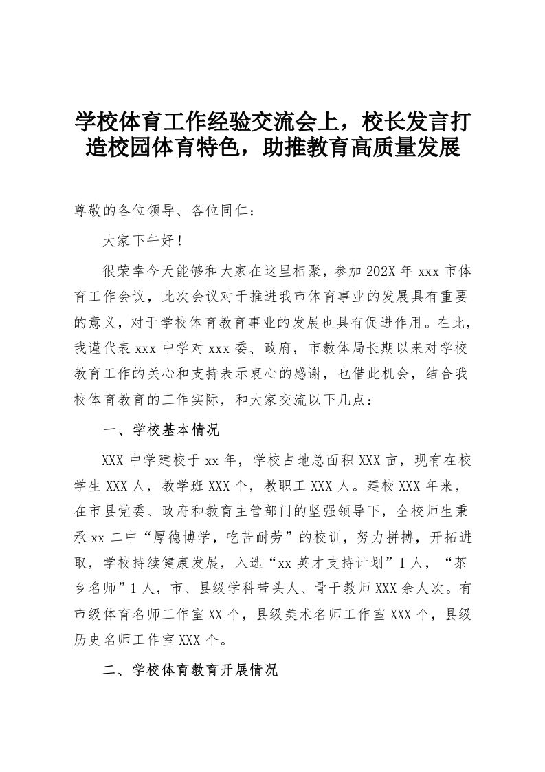 学校体育工作经验交流会上,校长发言打造校园体育特色,助推教育高质量发展尊敬的各位领导、各位同仁:大家下午好!很荣幸今天能够和大家在这里相聚,参加202X年xxx市体育工作会议,此次会议对于推进我市体育事业的发展具有重要的意义,对于学校体育教育事业的发展也具有促进作用。在此,我谨代表xxx中学对xxx委、政府,市教体局长期以来对学校教育工作的关心和支持表示衷心的感谢,也借此机会,结合我校体育教育的工作实际,和大家交流以下几点:一、学校基本情况XXX中学建校于xx年,学校占地总面积XXX亩,现有在校学生XXX人,教学班XXX个,教职工XXX人。建校XXX年来,在市县党委、政府和教育主管部门的坚强领导下,全校师生秉承Xx二中“厚德博学,吃苦耐劳”的校训,努力拼搏,开拓进取,学校持续健康发展,入选“xx英才支持计划”1人,“茶乡名师”1人,市、县级学科带头人、骨干教师XXX余人次。有市级体育名师工作室XX个,县级美术名师工作室XXX个,县级历史名师工作室XX个。二、学校体育教育开展情况