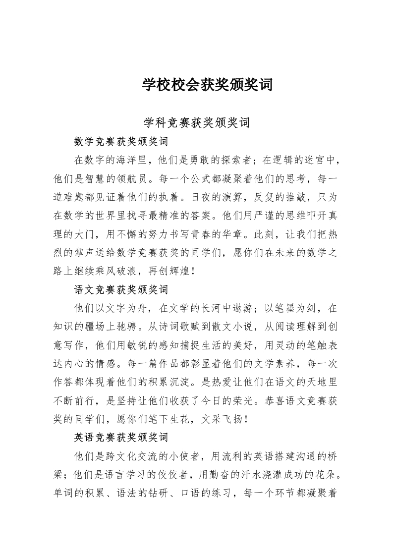 学校校会获奖颁奖词学科竞赛获奖颁奖词数学竞赛获奖颁奖词在数字的海洋里,他们是勇敢的探索者;在逻辑的迷宫中,他们是智慧的领航员。每一个公式都凝聚着他们的思考,每一道难题都见证着他们的执着。日夜的演算,反复的推敲,只为在数学的世界里找寻最精准的答案。他们用严谨的思维叩开真理的大门,用不懈的努力书写青春的华章。此刻,让我们把热烈的掌声送给数学竞赛获奖的同学们,愿你们在未来的数学之路上继续乘风破浪,再创辉煌!语文竞赛获奖颁奖词他们以文字为舟,在文学的长河中遨游:以笔墨为剑,在知识的疆场上驰骋。从诗词歌赋到散文小说,从阅读理解到创意写作,他们用敏锐的感知捕捉生活的美好,用灵动的笔触表达内心的情感。每一篇作品都彰显着他们的文学素养,每一次作答都体现着他们的积累沉淀。是热爱让他们在语文的天地里不断前行,是坚持让他们收获了今日的荣光。恭喜语文竞赛获奖的同学们,愿你们笔下生花,文采飞扬!英语竞赛获奖颁奖词他们是跨文化交流的小使者,用流利的英语搭建沟通的桥梁;他们是语言学习的佼佼者,用勤奋的汗水浇灌成功的花朵。单词的积累、语法的钻研、口语的练习,每一个环节都凝聚着