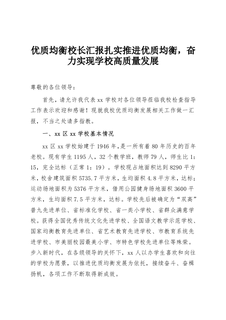 优质均衡校长汇报扎实推进优质均衡,奋力实现学校高质量发展尊敬的各位领导:首先,请允许我代表xx学校对各位领导莅临我校检查指导工作表示欢迎和感谢!现就我校优质均衡发展相关工作做一汇报,不当之处请多指教。一、x区Xx学校基本情况xx区xx学校始建于1946年,是一所有着80年历史的百年老校。现有学生1195人,32个教学班,教师79人,师生比1:15,完全达标(正常1:19)。学校现占地面积达到8290平方米,校舍建筑面积5735.7平方米,生均面积4.8平方米,达标:运动场地面积为5376平方米,借用公园健身场地面积3600平方米,生均面积7.5平方米,达标。学校先后被确定为“双高”普九先进单位、省标准化学校、省一类小学校、省群众满意学校。获得全国优秀传统文化先进学校、全国语文教学示范学校、国家均衡教育先进单位、省艺术教育先进学校、市教育系统先进学校、市美丽校园最美小学、市特色学校先进单位等殊荣。步入新时代,在各级领导的关怀下,xx人以办学生喜欢和向往的学校为愿景,以推进优质均衡发展为依托,接续奋斗、奋楫扬帆,各项工作不断取得新成效。