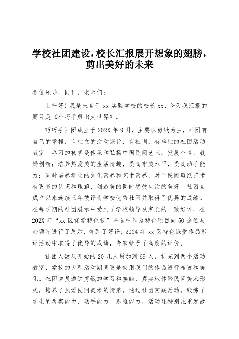 学校社团建设,校长汇报展开想象的翅膀,剪出美好的未来各位领导,同仁,老师们:上午好!我是来自于Xx实验学校的校长Xx,今天我汇报的题目是《小巧手剪出大世界》。巧巧手社团成立于202X年9月,主要以剪纸为主,社团有自己的章程,有独立的活动宗旨,有社训,有单独的社团活动教室。办团的初衷是传承和弘扬中国民间艺术;发展个性、鼓励创新;培养热爱美的生活情趣,提高审美水平,提高动手能力;同时培养学生的文化素养和艺术素养,对于民间剪纸艺术有更多的认识和理解,创造美的同时感受生活的美好。社团自成立以来连续三年被评为学校优秀社团并取得了优异的成绩。在每学期的社团展示中受到了学校领导及家长的一致好评,在202X年“xx区宜学特色校”评选中作为特色项目向50余位与会领导进行了展示,得到了好评;2024年xx区特色课堂作品展评活动中取得了优异的成绩,专家给予了高度的评价。社团人数从开始的20几人增加到69人,扩充到两个活动教室,学校的大型活动期间更是使用我们的作品进行布置和美化。社团成员通过剪纸的学习和接触,真实地体验民间美术形式,培养了热爱民间美术的情感。通过社团实践活动,锻炼了学生的观察能力、动手能力、思维能力,活动还特别注重发散