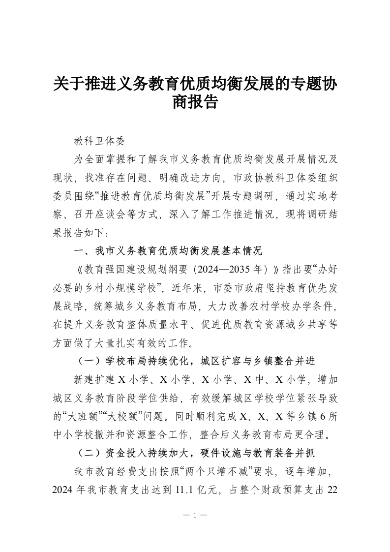 关于推进义务教育优质均衡发展的专题协商报告