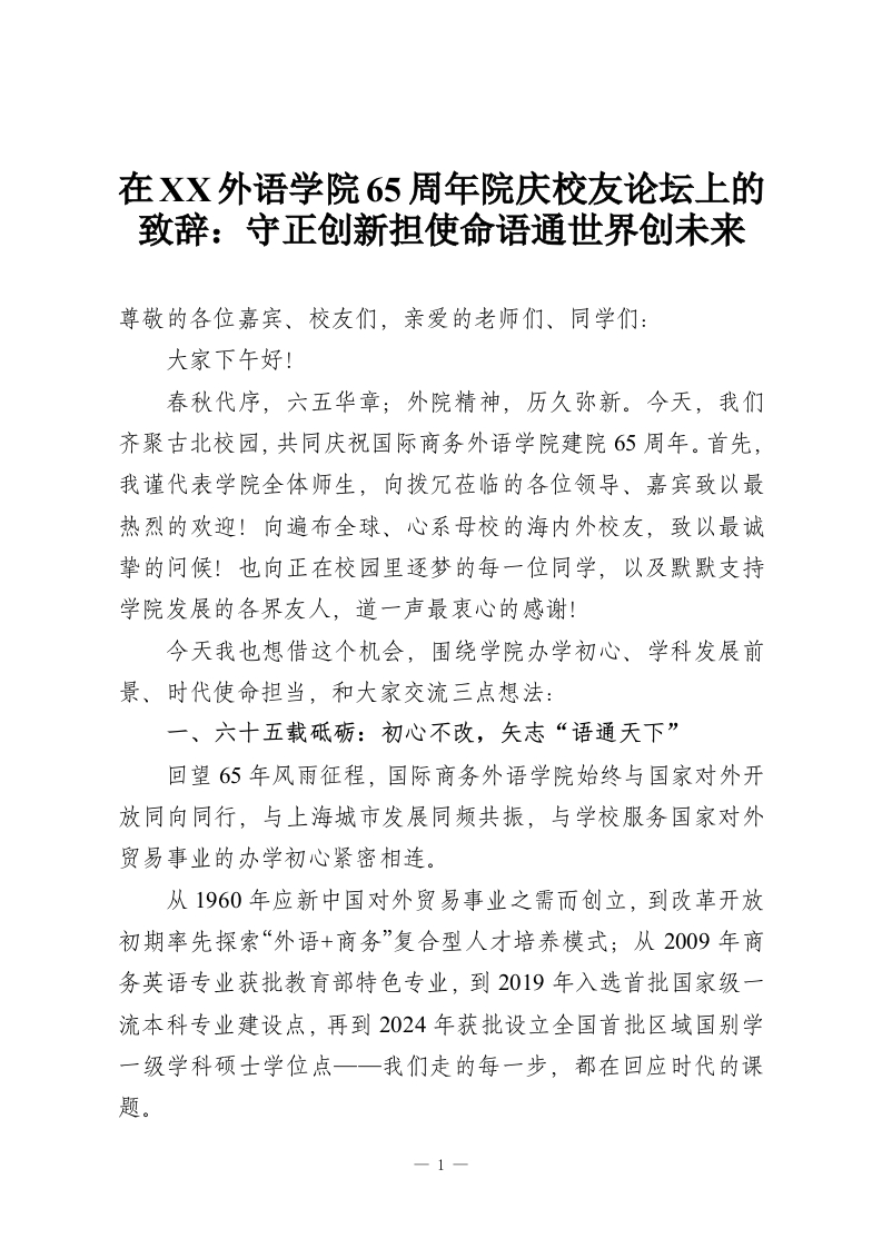 在XX外语学院65周年院庆校友论坛上的致辞:守正创新担使命语通世界创未来