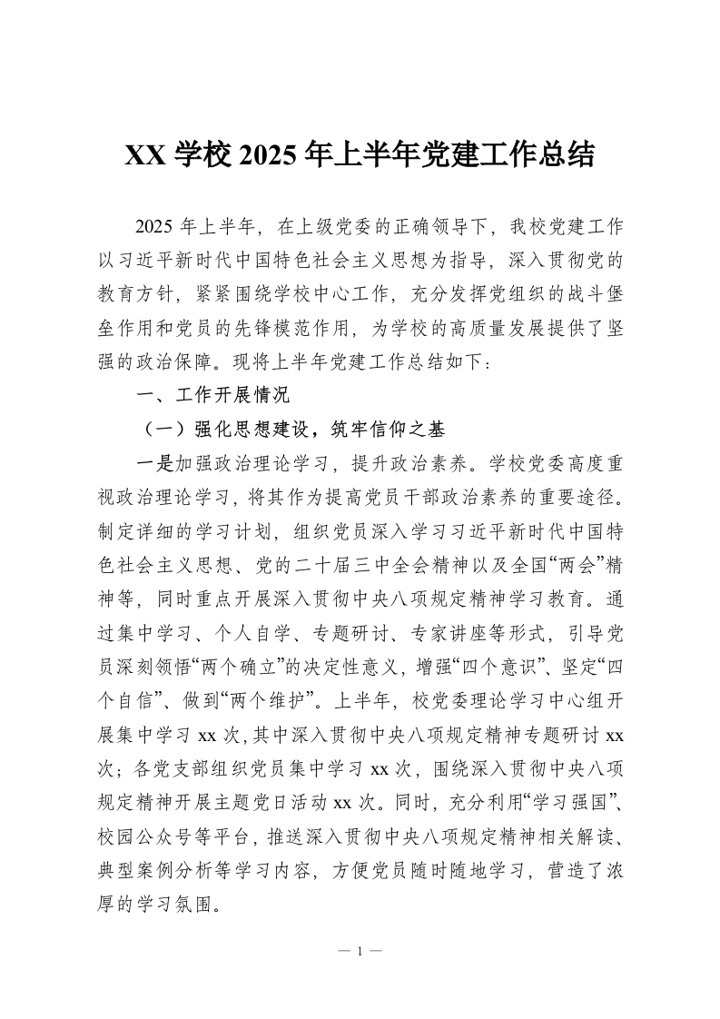 XX学校2025年上半年党建工作总结