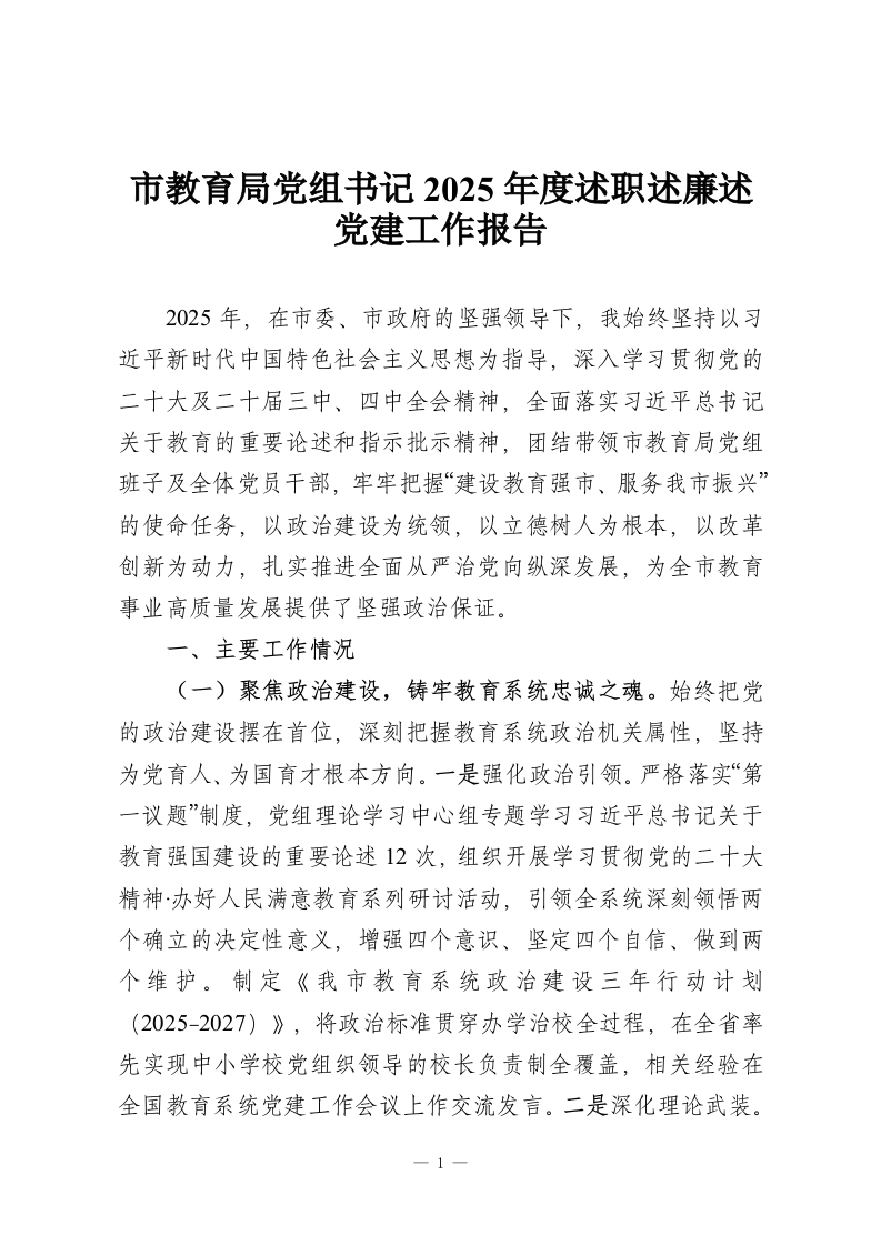 市教育局党组书记2025年度述职述廉述党建工作报告