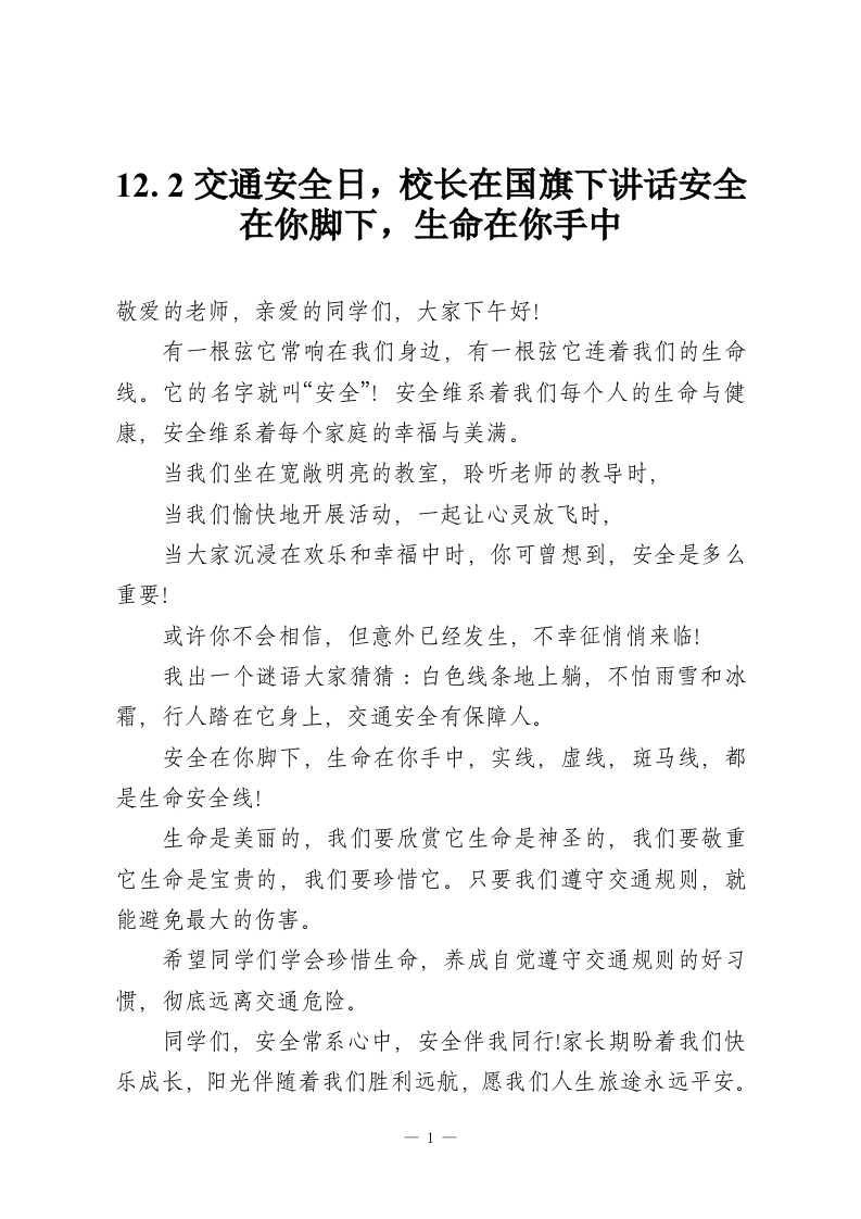 12.2交通安全日,校长在国旗下讲话安全在你脚下,生命在你手中
